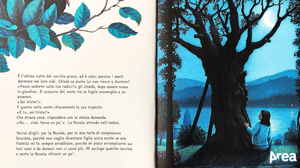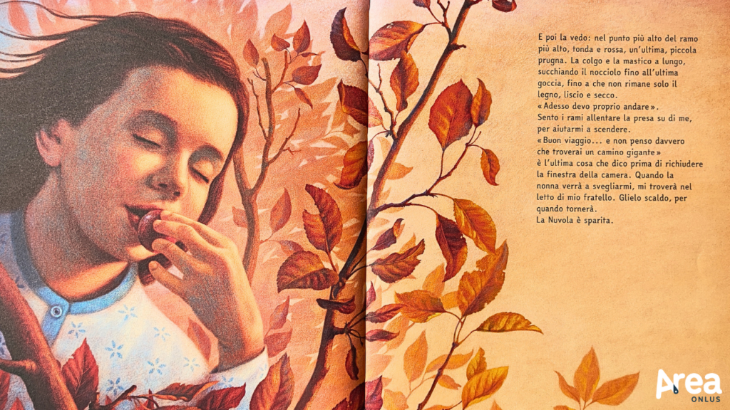 Nel dialogo tra una bambina preoccupata per la sorte del fratello malato e un pruno ormai prossimo all’abbattimento, i due autori indagano il legame che ci avvicina alla natura, lo scarto tra ciò che scompare e ciò che resta con la morte, il valore della trasformazione e la varietà di forme che possono assumere la cura e il ricorso. Con uno stampo squisitamente metaforico, che vede i pensieri cupi farsi nuvola tempestosa o una prugna succosa rappresentare la memoria che dà frutto – l’albo edito da Camelozampa esplora temi tutt’altro che banali e offre al lettore una forma di poesia che prescinde da versi e rime.