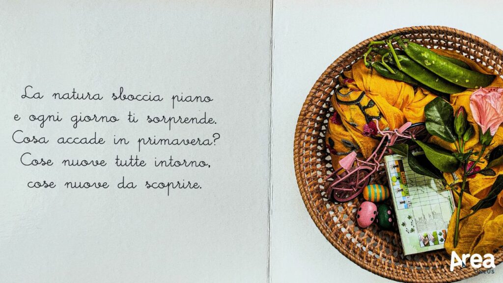 I cestini dei tesori, in particolare, prevede tre sezioni, ognuna dedicata a un potenziale cestino dei tesori fisicamente realizzabile ad uso del bambino e contraddistinto da uno specifico filo conduttore: gli oggetti di casa, i materiali naturali e i colori. Di ogni cestino è proposta una fotografia iniziale, con inquadratura dall’alto, che offre una visione d’insieme, e poi un focus sui singoli oggetti che lo compongono ripresi perlopiù frontalmente e associati alla parola che consente di nominarli. Gli oggetti sono distribuiti sulla pagina in maniera ariosa e propizia alla scoperta senza che il bambino venga eccessivamente sovraccaricato di stimoli. Il loro affiancamento segue principi diversi, legati al colore, al materiale o all’ambito di utilizzo. Questo genera accostamenti insoliti e sorprendenti, proprio come accade nella realtà, quando il bambino sceglie dal cesto, affianca e fa interagire tra loro oggetti che nella quotidianità sono magari distanti.