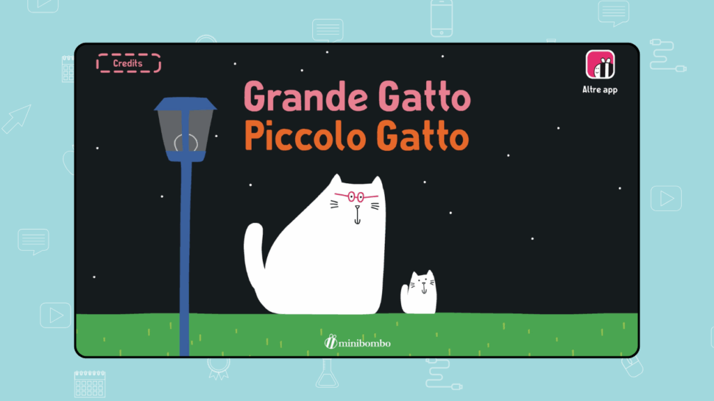 La passeggiata serale di Grande Gatto e Piccolo Gatto, come nell’omonimo libro di Silvia Borando, si rivela piena di imprevisti e sorprese. Quale sarà l’obiettivo di questa scampagnata notturna che costringe i nostri amici ad attraversare laghetti, passare nelle tubature, aprire porte e finestre e soprattutto non svegliare il cane che dorme beato? Lo scopriranno i piccoli utenti che giocano con questo simpatico libro animato, se così si può definire quest’app, che con sapienza e maestria, allena il bambino a risolvere i piccoli problemi che affollano la quotidianità di due gatti intraprendenti e avventurosi.