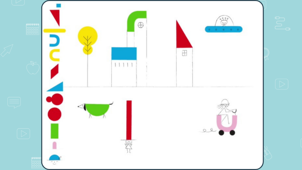 Una serie di forme sul lato sinistro dello schermo e un foglio bianco: un interfaccia molto essenziale, senza distrattori, permette di concentrarsi sulla pagina che man mano si costruisce. Trascinando le forme sul foglio infatti, esse si animano, creando paesaggi surreali e personaggi insoliti. Le forme possono essere spostate e così diventano qualcos’altro: se un rettangolo diventa un simpatico omino, spostandolo nella parte superiore dello schermo può essere un semaforo; un cerchio diventa un sole oppure un albero, mentre un cerchio da aquilone ad airone… Insomma un connubio di personaggi ed elementi divertenti e creativi. Se poi si cambia idea, nessun problema! Cliccando sulla figura la si può eliminare per poi ricominciare da capo.
