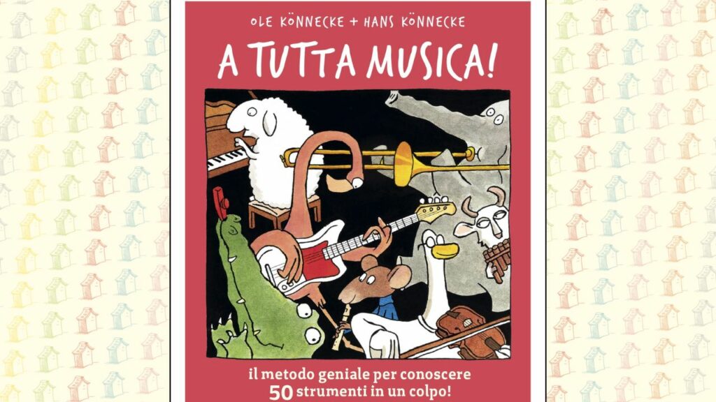 Scopo divulgativo, approccio interattivo, brevi testi e giocose illustrazioni in dialogo: A tutta musica! è decisamente un libro sui generis. Progettato e realizzato a 4 mani da Ole e Hans Konnecke, il volume invita a scoprire 52 strumenti musicali diversi, dai più comuni ai più originali. A ognuno di essi è dedicata una pagina che riporta un breve testo di tono leggero che riassume le caratteristiche dello strumento e/o qualche curiosità in merito – e un’illustrazione in cui lo strumento viene suonato da un animale antropomorfo.