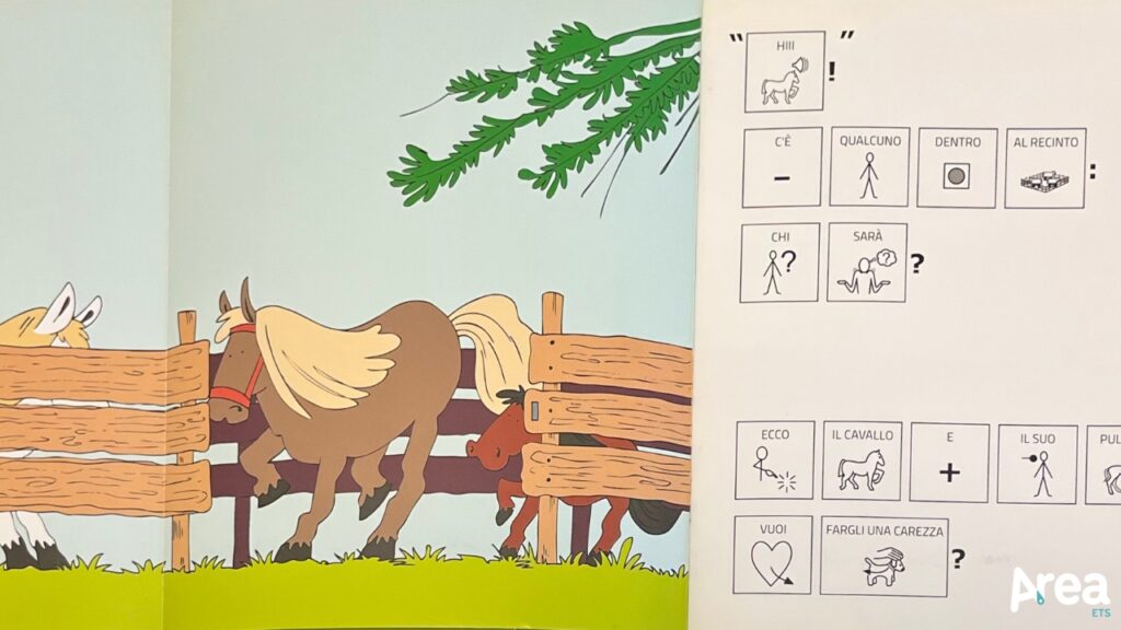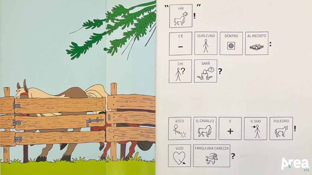 Il testo – lineare nella sintassi, quotidiano nel lessico, maiuscolo nella grafica – risulta agevole da seguire ma non eccessivamente ripetitivo. Supportato visivamente da simboli WLS (Widgit Literacy Symbols) riquadrati e disposti sulla pagina in modo da seguire l’andamento della frase, questi va a braccetto con le illustrazioni fresche e sorridenti di Piki che si diverte a nascondere in ogni tavola un piccolo topolino: un’occasione in più per il lettore di conoscere il libro anche come oggetto con cui si può giocare.