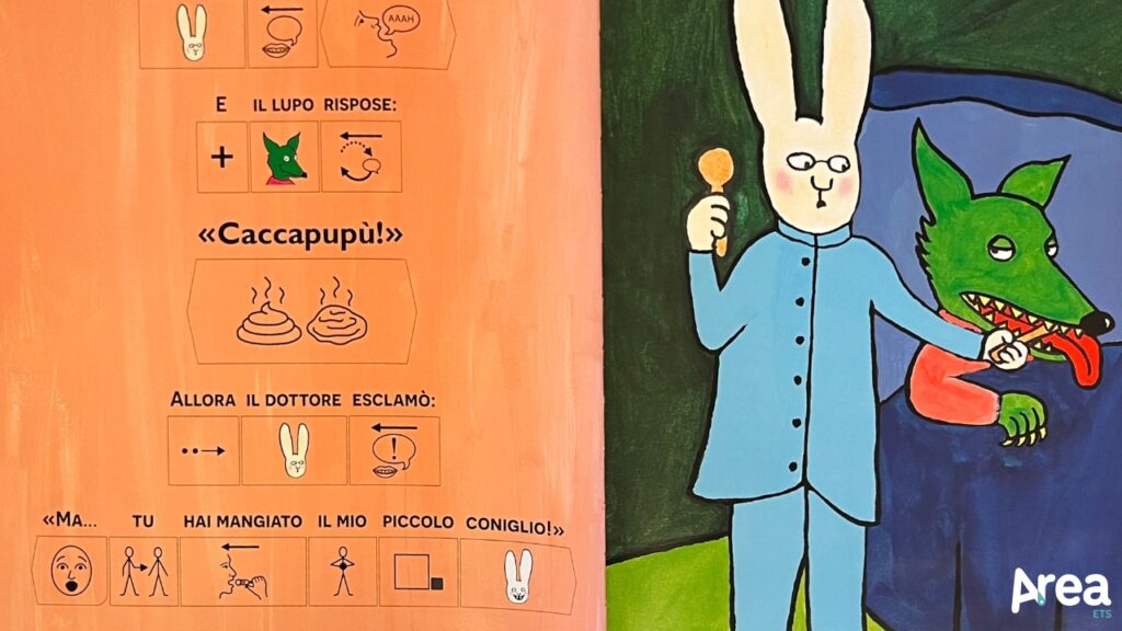 Non solo. Stephanie Blake compone il suo racconto con attenzione, donandogli ritmo e comprensibilità. Non a caso, nella versione in simboli curata da Officina Babùk, il testo non viene modificato di una virgola, poiché risulta già molto lineare e chiaro nella sua versione originale, perfetto per una simbolizzazione. Quest’ultima opta per l’uso dei simboli WLS, con riquadri molto sottili (e dunque graficamente poco invasivi) e testo in maiuscolo esterno ai riquadri, e per l’associazione di unità di senso (articolo + sostantivo, espressioni come “c’era una volta”, ecc…) a un unico simbolo. La distribuzione del testo sulla pagina, inoltre, segue fedelmente quella della versione originale. Come in quest’ultima, infine, testo e figure risultano sempre separati: questo fa sì che venga agevolato nel lettore il reperimento di entrambi e che un’eventuale lettura con modeling non vada a coprire le illustrazioni. Queste ultime, dal canto loro, appaiono molto nette, prive di dettagli superflui e contraddistinte, invece, da contorni spessi e da un uso del colore non necessariamente realistico