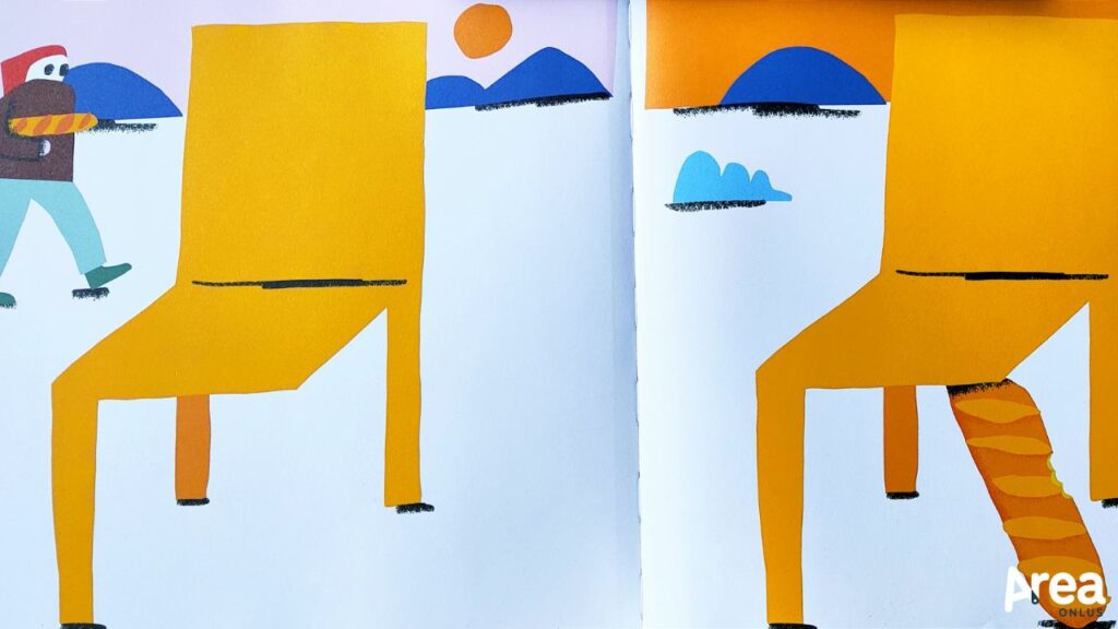 Quest’ultima si fonda inoltre su di una struttura iterata in quattro tempi (e due doppie pagine) che agevola l’aggancio e la comprensione: un personaggio si accorge che manca la gamba – mette un oggetto che funga da supporto – l’oggetto viene rimosso da qualcun altro – il problema iniziale si ripropone, e via da capo. Da ultimo, il volume si caratterizza per uno stile minimale in cui i pochi oggetti sulla scena vengono rappresentati con pochi tratti significativi attraverso i quali risulta più agevole interpretare sentimenti e azioni. Il risultato è un racconto per immagini molto eloquente che si presta tanto a letture individuali quanto a letture ad alta voce.