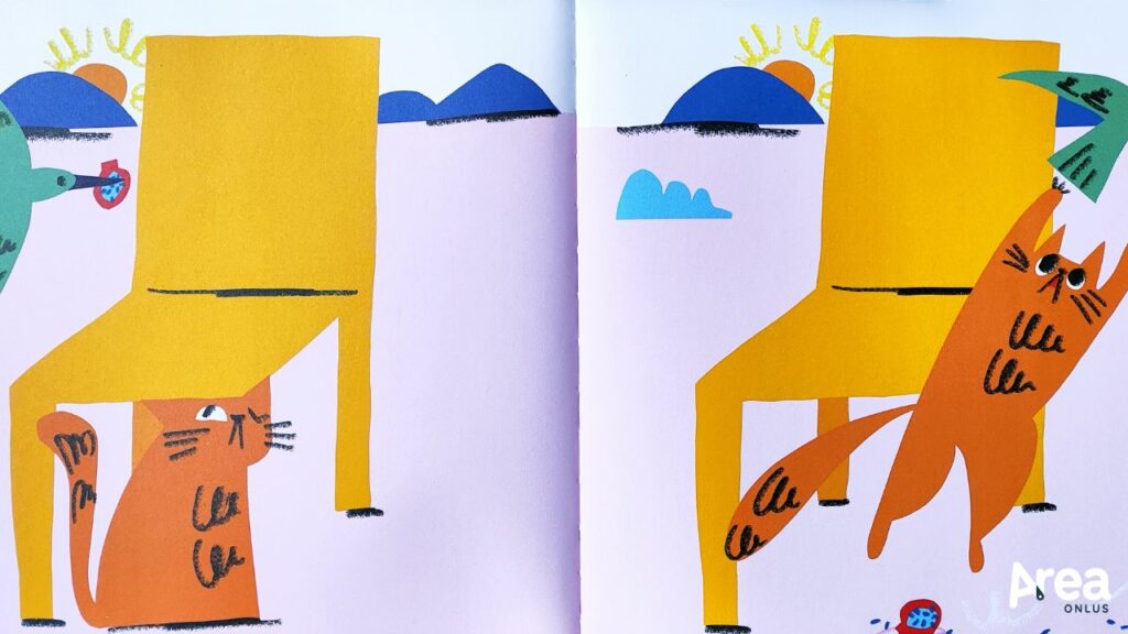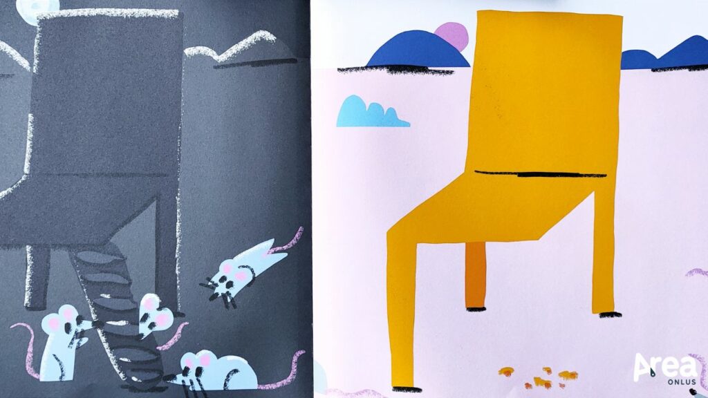 Delizioso, divertente e capace di aprire riflessioni interessanti attraverso la metafora della sedia a cui manca un pezzo, Cercasi gamba è un libro senza parole anche estremamente accessibile. Le sue ampie pagine di formato quadrato – come caratteristico dei volumi della collana Silent Book di Carthusia – accolgono infatti un’inquadratura fissa in cui la sedia protagonista è rappresentata in primo piano. Non vi sono elementi di contorno che possono creare confusione o distrarre il lettore. Gli unici dettagli che circondano il soggetto principale sono le poche ed essenziali linee delle montagne sullo sfondo che contestualizzano il racconto e quelle che scandiscono il tempo o delineano agenti atmosferici funzionali alla narrazione.