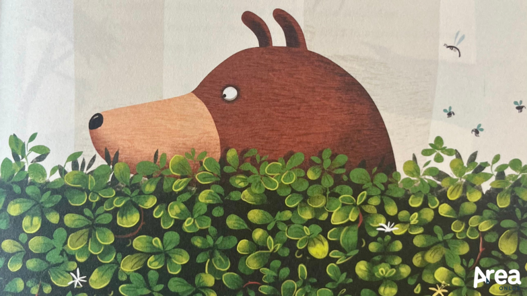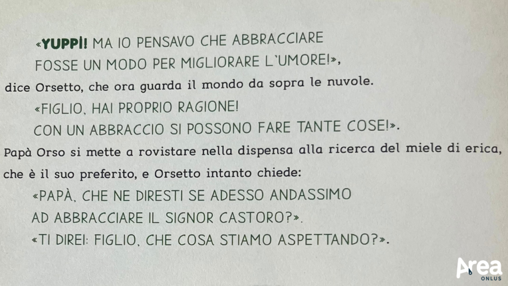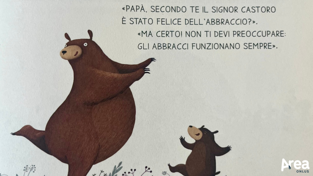 La storia è semplice: papà orso e figlio orso, tra i più mansueti che si possa immaginare, vanno a zonzo per la foresta alla ricerca di creature da abbracciare. Nessuna restrizione sui destinatari – conigli, donnole, anaconde e persino cacciatori armati di fucile! – e nessun doppio fine – l’abbraccio non è che il segreto per (far) avere un giorno perfetto. Uno dopo l’altro, i due incontrano e stringono affettuosamente chiunque capiti loro a tiro, superando perplessità (per esempio del castoro), diffidenza (per esempio del lupo), difficoltà tecnica (per esempio con il bruco), e fifa blu (per esempio, manco a dirlo, dell’umano), trasformandoli in sentimenti di segno positivo come leggerezza, felicità e commozione. Una stretta e un sorriso trova posto nella giornata: è matematico, succede sempre (o quasi… il cacciatore è ancora troppo tramortito per dire la sua).