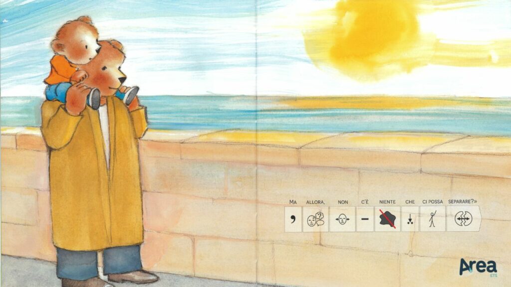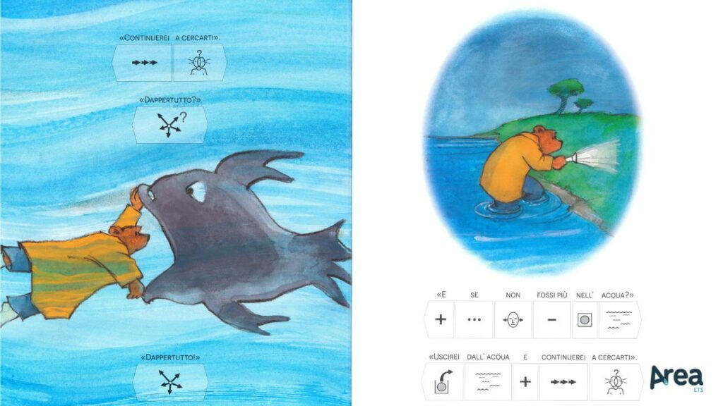 Il testo, dal canto suo, predilige costrutti brevi e lineari che ben si prestano alla simbolizzazione. Quest’ultima, basata sul ricorso alla collezione WLS, procede in maniera molto puntuale, associando un simbolo a ogni parola, fatto salvo per gli articoli (uniti ai relativi sostantivi) e per quelle preposizioni i cui simboli di riferimento potrebbero risultare ridondanti (es: uscire da). Il risultato è un adattamento poco invasivo dal punto di vista grafico e idoneo a supportare in maniera fluida anche la lettura ad alta voce.