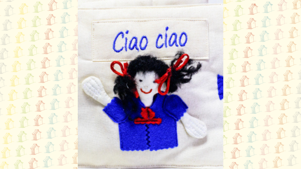 Che buono!, Cucù…settete e Ciao ciao, questi i titoli dei volumi editi, uniscono i punti di forza di tre tipologie di libri accessibili – i libri in LIS, tattili e senza parole – garantendo la possibilità di piena fruizione da parte di lettori con disabilità visiva, uditiva, intellettiva, comunicativa oltre che di lettori con DSA e di lettori semplicemente curiosi. Ogni volume si compone di pagine di stoffa ridottissime in numero (quattro nella fattispecie) ma estremamente stimolanti e interattive. Su di ognuna sono infatti cuciti alcuni oggetti inerenti al tema trattato, anch’essi realizzati perlopiù in tessuto e in buona parte estraibili e manipolabili a 360 °, pur essendo assicurati alla pagine grazie a un nastrino. Nella taschina apposta in quarta di copertina il lettore può trovare quattro tesserine che richiamano le illustrazioni interne, con una rappresentazione fedele in miniatura, e vi associano il corrispettivo segno della Lingua dei Segni Italiana.