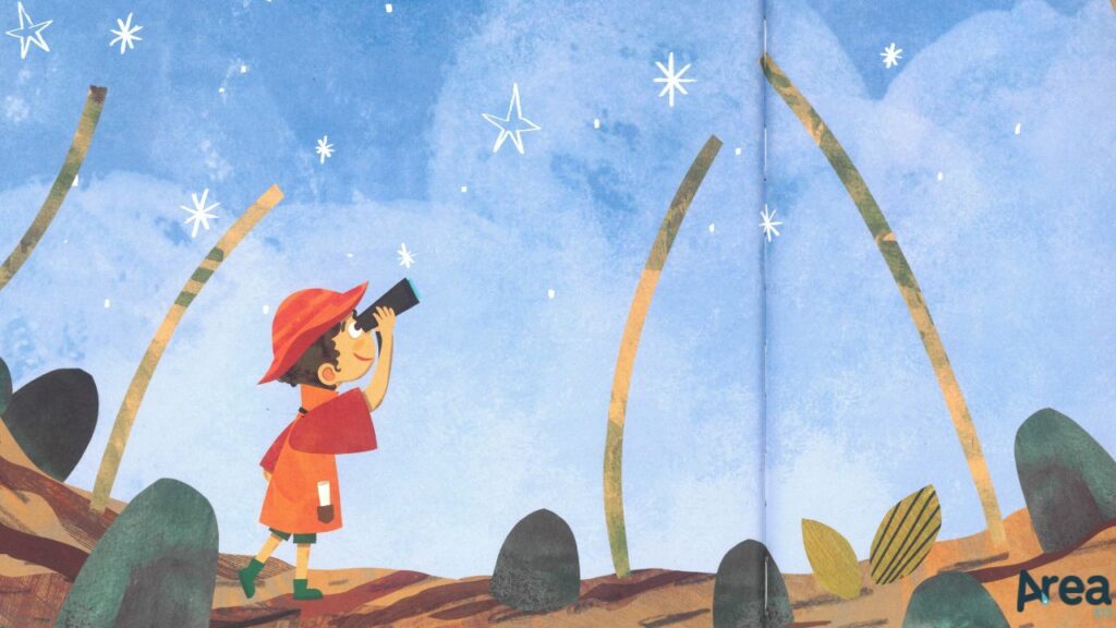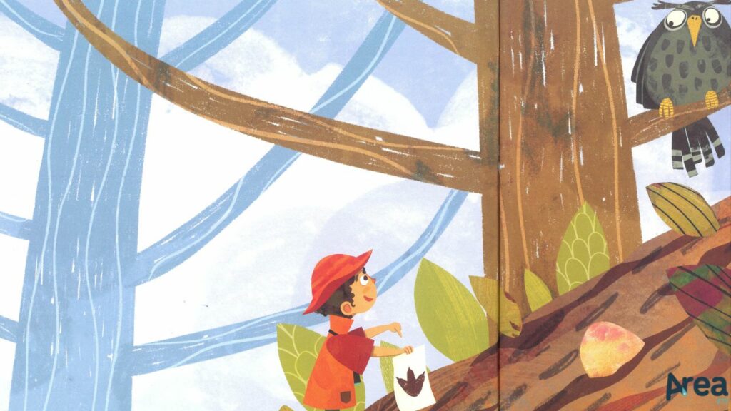 La forza di questo albo senza parole sta proprio nel giocare con equilibrio tra regolarità (per esempio nei successivi incontri con i diversi animali, ciascuno dei quali indica al protagonista di salire ancora un poco) e sorpresa, alternando inquadrature diverse che di volta in volta celano o svelano dettagli chiave. Questo fa sì che al lettore siano richieste alcune inferenze non scontate e una certa scioltezza di movimento tra le pagine. Grande soddisfazione aspetta dunque quei lettori che si muovono con agio tra le figure. D’altra parte, la trama è molto lineare e non c’è mai eccessivo affollamento sulla pagina. Per questo, se opportunamente guidato, anche chi sperimenta difficoltà di tipo cognitivo può felicemente godere di questa lettura.