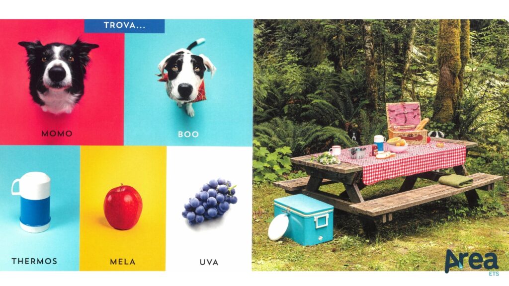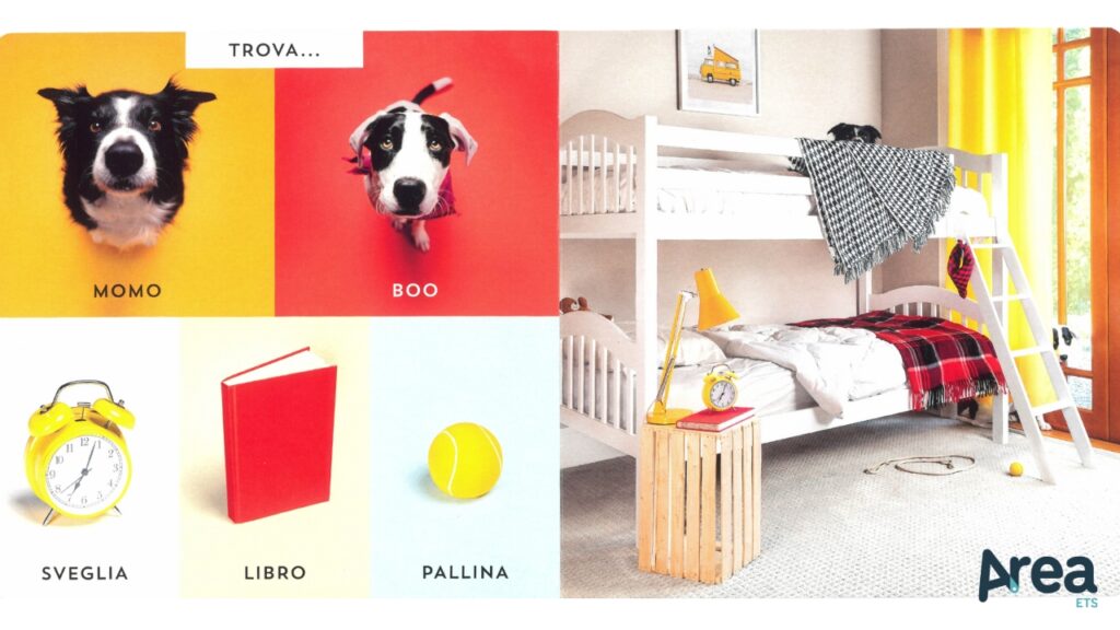 Le stesse considerazioni fatte a proposito di questo primo volume, dal canto loro, possono essere prese e riproposte pari pari anche per il secondo, Dov’è Momo in giro?. Pensiamo, in particolare, all’immediatezza delle immagini fotografiche, alla struttura grafica ricorrente e rassicurante (riquadri con soggetti e oggetti nominati a sinistra, fotografia a campo largo in cui cercarli a destra), alla dinamica ludica del cerca-trova che incentiva la verbalizzazione e all’accostamento minimale tra immagine fotografica e parola che ricorda il funzionamento dei simboli della CAA.
