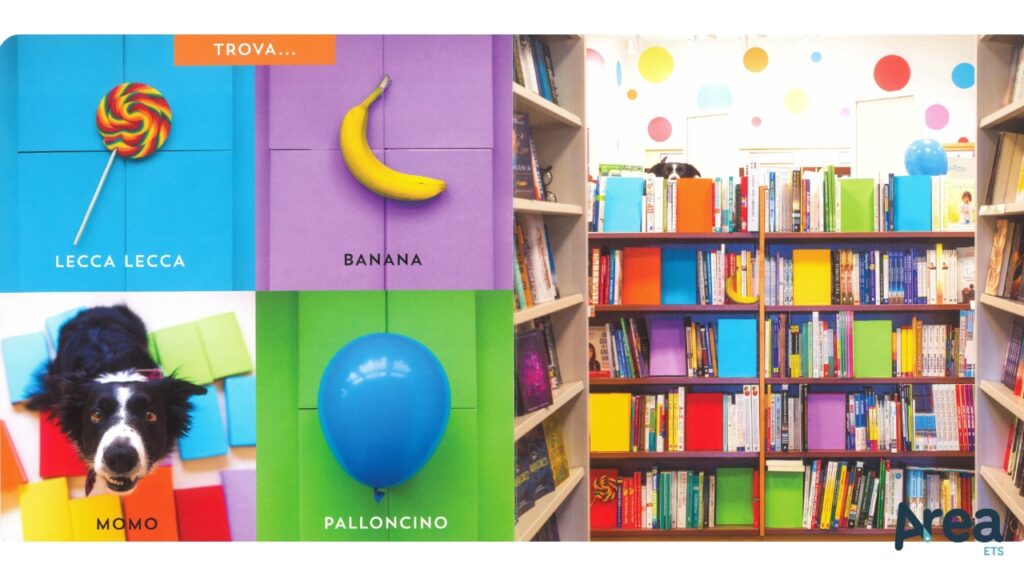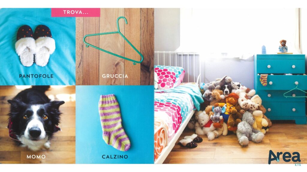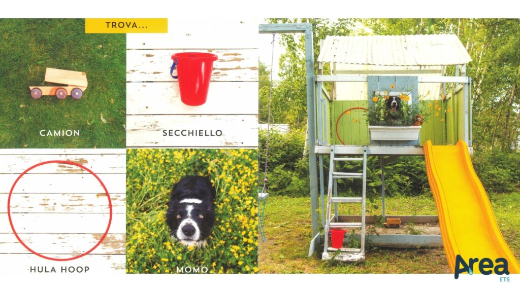 Nato da un’idea coltivata su Instagram e pubblicato per la prima volta in America con il titolo Let’s find Momo!, il libro di Andrew Knapp risulta estremamente accattivante ma anche molto fruibile. In primo luogo perché sfrutta immagini fotografiche, molto immediate, riconoscibili e apprezzate anche che parte di lettori con difficoltà di astrazione. In secondo luogo perché presenta una struttura grafica sempre identica in cui il lettore può ritrovarsi senza sorprese e in cui ogni oggetto è puntualmente associato alla parola che lo identifica, come in una sorta di simbolo della CAA in forma fotografica. E infine perché la dinamica ludica sottesa al volume supporti e solleciti competenze come quella di nominare le cose e riconoscere le figure, catturando con facilità il lettore.