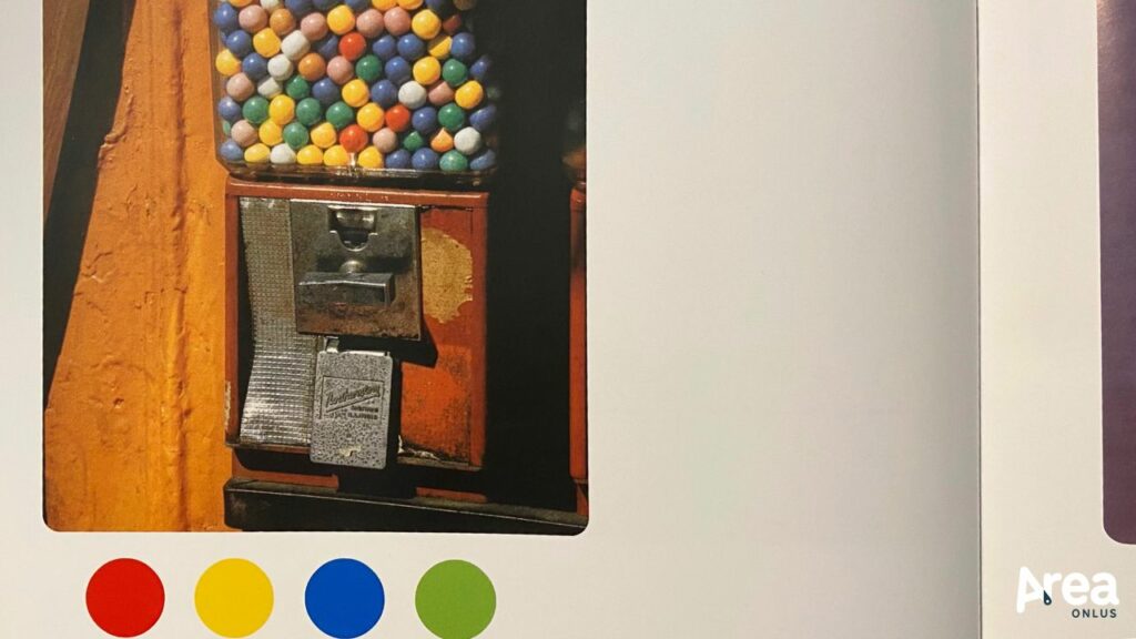 In quanti modi, poi, si possono leggere le fotografie di È rosso? È giallo? È blu?, tutte peraltro contraddistinte da inquadrature nette per quanto non scontate, soggetti decifrabili (ombrelli, foglie, caramelle e occhiali popolano senza dubbio la quotidianità del lettore, anche a distanza di 35 anni dalla prima pubblicazione del libro), assenza di dettagli superflui, chiara presenza dei colori indicati? Moltissimi! Tra quelle figure si può sperimentare il piacere del riconoscimento dei soggetti, del ritrovamento cromatico, del confronto tra figure ravvicinate, della minima costruzione narrativa e dell’invenzione, solo per fare qualche esempio. Un estintore che pare quasi un personaggio animato o un bambino con una scatola in testa invitano quasi istintivamente a ritrovare in un’immagine statica lo spunto per andare oltre, per inventare. Allo stesso modo, l’accostamento apparentemente neutro di una bambina in bicicletta e di un parcheggio affollato porta a far emergere un numero inatteso di categorie – singolare/plurale, staticità/movimento, ordine/disordine, umano/inanimato… – con le quali interrogare ciò che ci si trova davanti e ad attivare così una sorta di dialogo figurato.