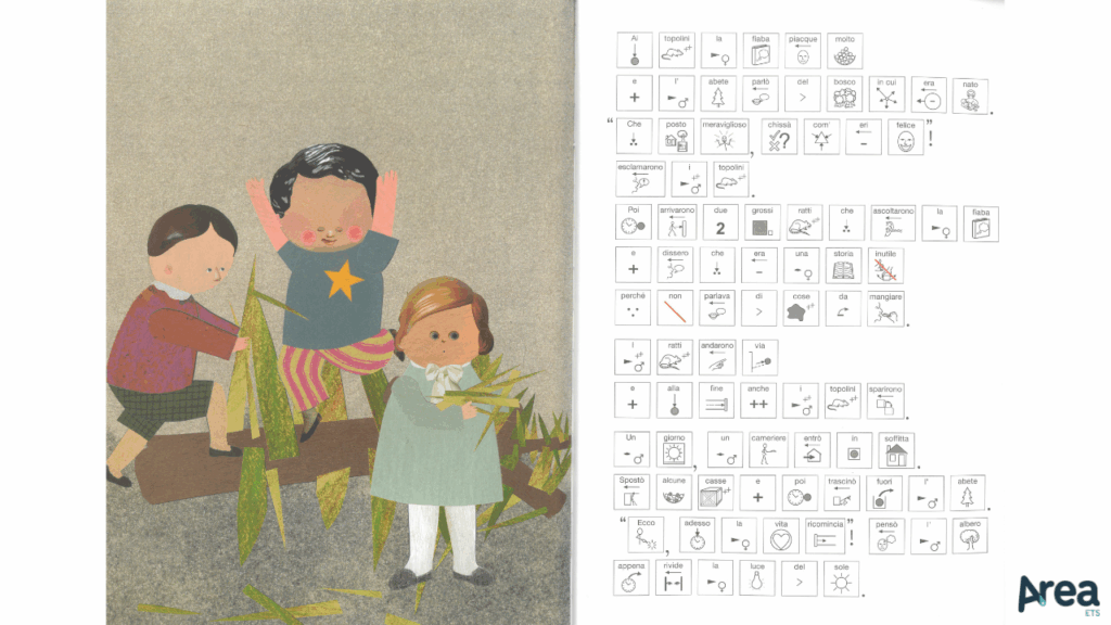 Inattese, perturbanti, talvolta criptiche e sempre dense di poesia, le illustrazioni di questo volume sottendono una scelta inusitata e apprezzabile. Esse denotano il desiderio di offrire anche ai bambini con difficoltà comunicative delle figure che non siano solo pura didascalia e che non servano necessariamente a consolidare la comprensione. Qui le figure, infatti, hanno tutt’altra funzione: attraggono, interrogano, evocano, dicono le emozioni più che i fatti. E questo è coraggioso e importante: perché magari saranno meno d’aiuto di altre a seguire il racconto ma offriranno un’opportunità nuova, sfidante e autentica, soprattutto per chi è abituato ai canoni visivi dell’editoria in simboli. Senza scordare, poi, che figure così affascinanti possono rappresentare una chiave significativa di condivisione del libro con chi non necessita di specifici accorgimenti di lettura.