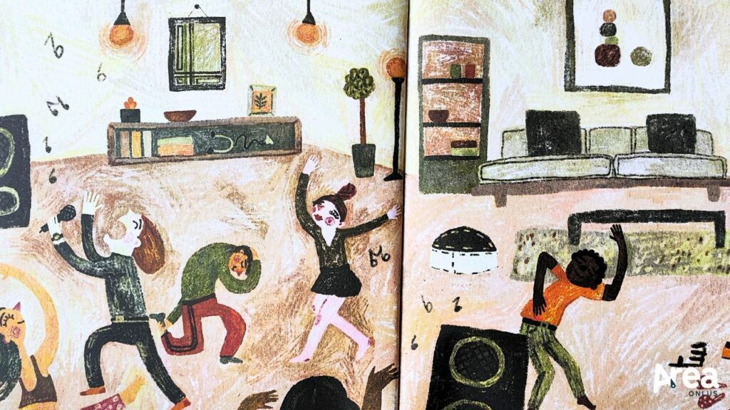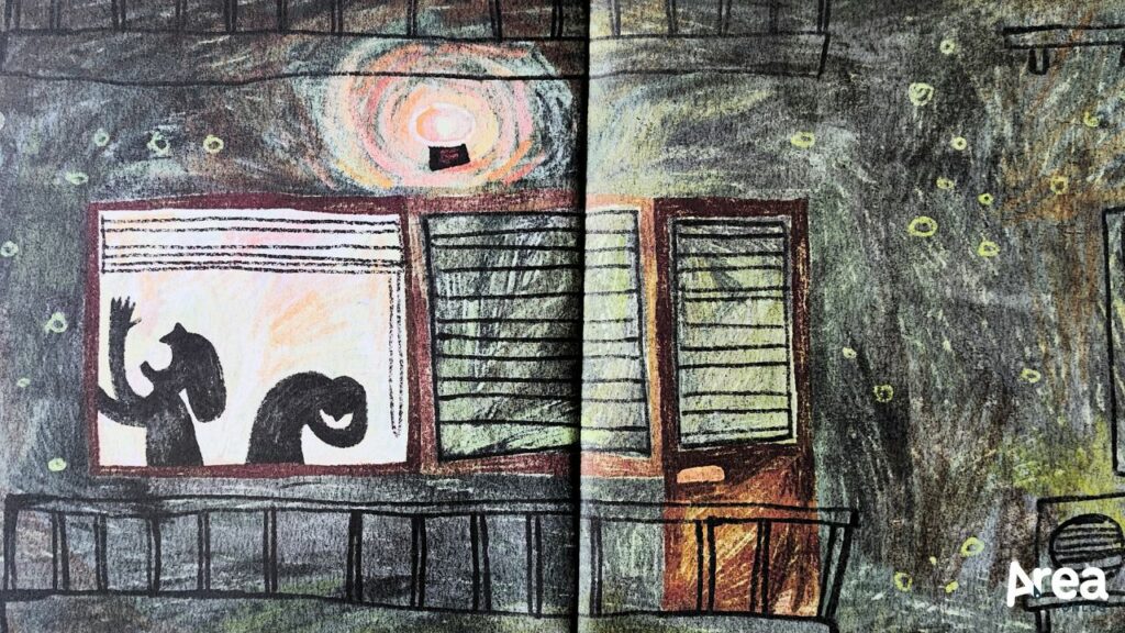 Ed è qui che emerge con gioiosa allegria, l’equivoco generato dalla semioscurità. Ciò che sembrava non è: abbuffate di sushi, balli sfrenati, coccole confortanti, tentativi di rinfrescamento e appassionate sessioni di hobbistica vengono alla luce in tutta la loro vivacità, anche cromatica. I toni caldi e avvolgenti diventano protagonisti e catapultano il lettore all’interno di contesti dinamici che molto fanno immaginare. Anche la bambina incontrata in apertura non è esente dal gioco delle apparenze: con lei e con il suo affettuoso gatto si chiude, infatti, questa narrazione fatta di molti inganni, pochi colori e nessuna parola.