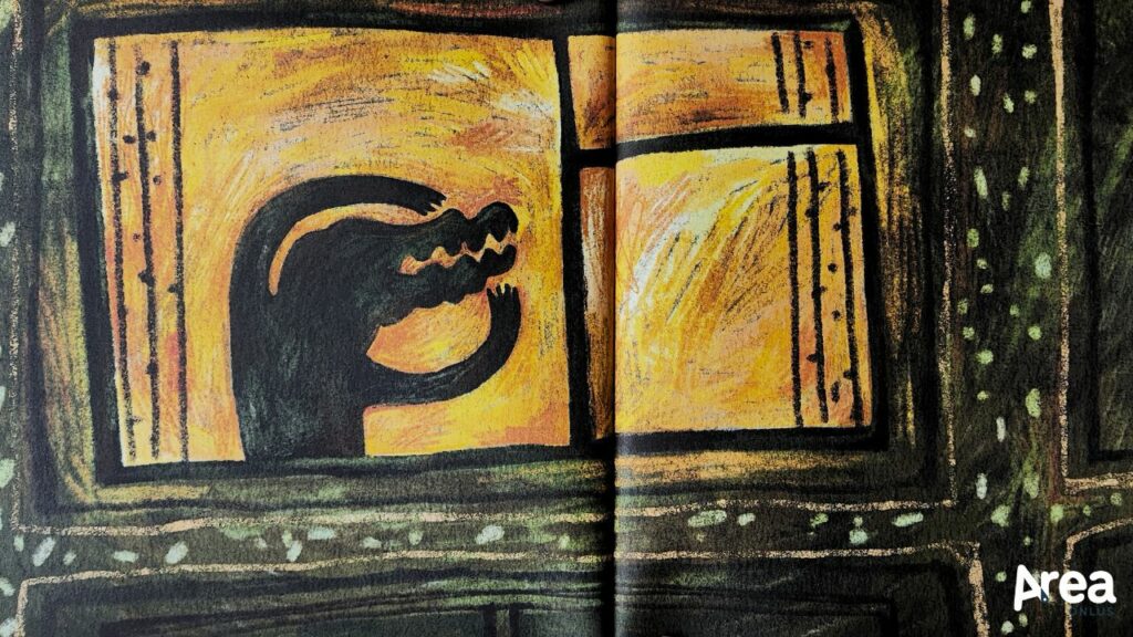 Il libro assume il punto di vista di una bambina che troviamo assorta nei suoi pensieri mentre guarda fuori dalla sua finestra di casa. L’immagine di apertura ci dice che il palazzo in cui la bambina vive è alto e circondato da edifici simili: le cose da osservare sono dunque potenzialmente numerose. Attraverso lo sguardo della protagonista, ci soffermiamo su alcune finestre illuminate, mentre fuori il buio della notte avvolge la città. Le sagome che si delineano sembrano appartenere a inquilini isolati, litigiosi, minacciosi o inquietanti: vecchiette chine sul loro solitario lavoro a maglia, coniugi in preda alla disperazione, uomini mastodontici o desolati e persino coccodrilli furibondi… ma la realtà, spesso, non è come appare e così a ogni doppia pagina in cui emerge un’ombra perturbante, ne segue un’altra che inquadra il soggetto dall’interno della stanza, perfettamente illuminato.