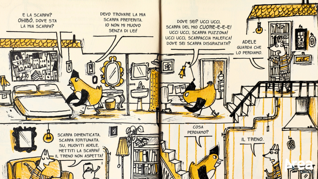 Il cambiamento può iniziare in molti modi. Con una scarpa che si dà alla fuga, per esempio! E in effetti quando la scarpa preferita di Adele decide di scomparire proprio alla vigilia della partenza per le vacanze, l’abitudinaria pennuta è costretta suo malgrado a rimettere in discussione le sue amate routine. Impossibile per lei partire con il solito treno, il solito giorno di luglio per andare nella solita località di montagna con il marito Alfio: tocca rimettere in discussione i piani. E così, in quello che si rivelerà essere l’agosto più movimentato della vita dei due protagonisti, la caccia alla scarpa li porterà a frequentare i luoghi più disparati, dalle chiese alle discoteche, e a far la conoscenza dei personaggi più inattesi, dall’inquilino abusivo Aristide ai due poliziotti vicini di casa Assenzio a Anastasio. Alla fine la famigerata scarpa farà ritorno a casa. Niente però sarà più come prima per Adele e Alfio, ché per una scarpa smarrita c’è un mondo di cose da fare, scoprire e non lasciare (forse) mai più.