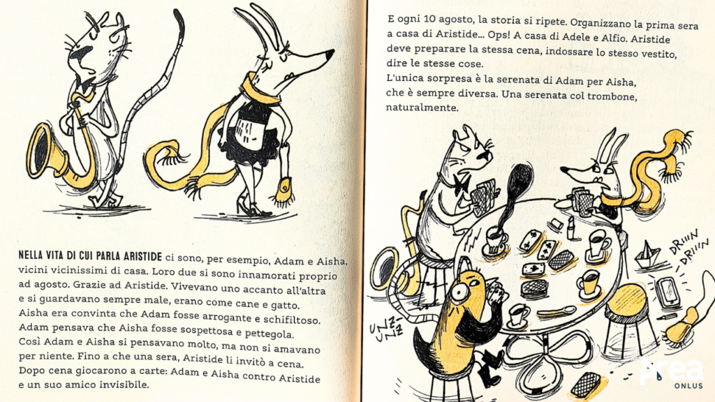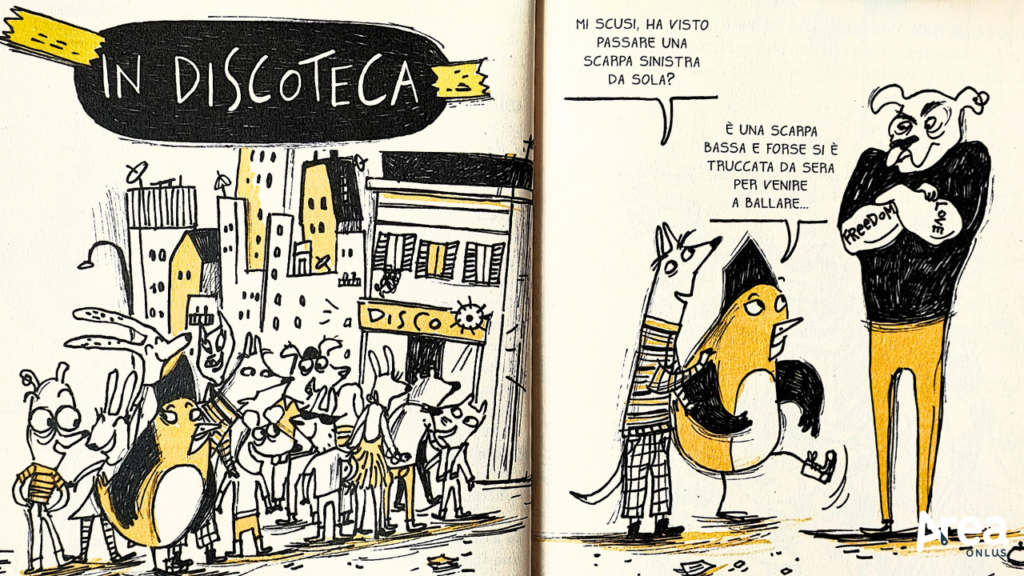 Fuga in punta di piedi, che fa parte della collana Prima graphic di Sinnos, attira prima di tutto per le sue illustrazioni dinamiche e particolareggiate, in cui il contrasto tra il bianco e nero di fondo e i dettagli in giallo vivace attirano l’occhio e accendono la curiosità. Su questa scia, ci si fa strada in una trama che impasta un sottile umorismo e uno spiccato gusto per l’assurdo, mettendo insieme personaggi buffi e ben assortiti. Il risultato è una storia coinvolgente che, imprevedibile com’è, ci si chiede di continuo dove possa portare. Costruito mescolando racconto tradizionale e narrazione a fumetto, il libro di Daniela Palumbo e Francesca Carabelli vanta inoltre un ritmo insolito e meno affaticante che, spostato ad altre caratteristiche di alta leggibilità come la font leggimi, la spaziatura maggiore e la grafica pulita, incentiva e supporta la letture anche da parte di lettori meno forti o con maggiori difficoltà legate alla dislessia.