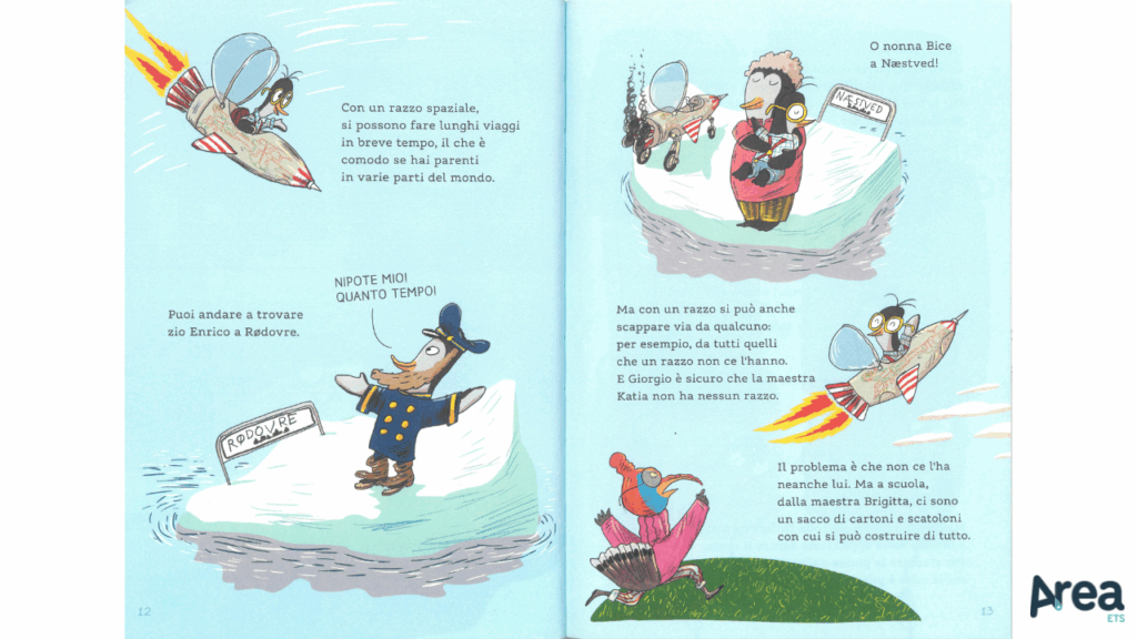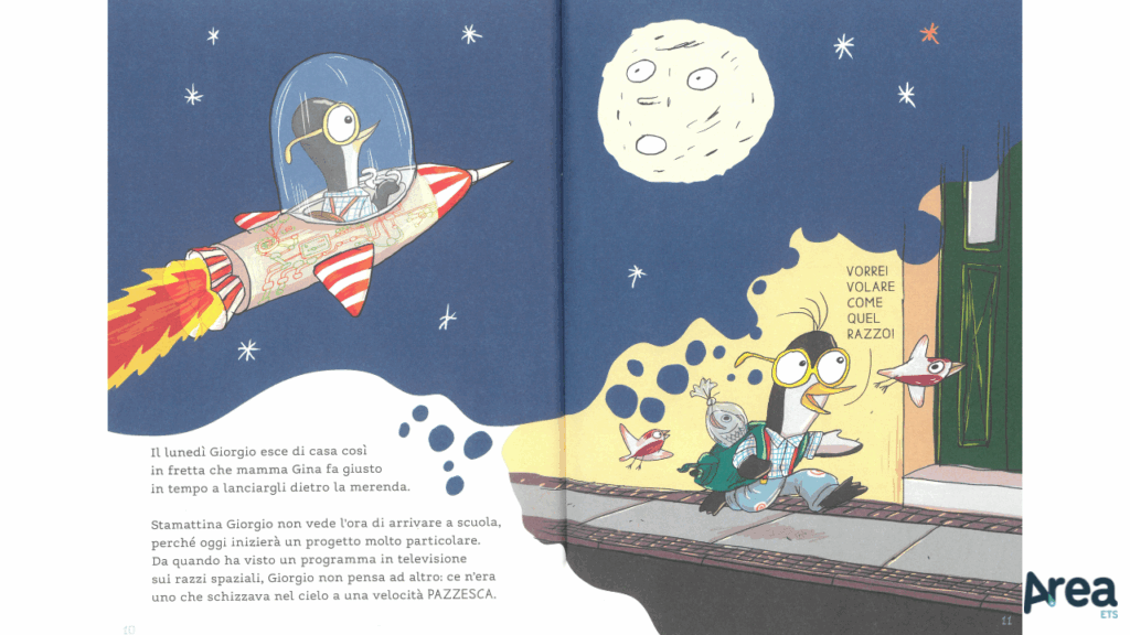 Già protagonista di una precedente vicenda (Giorgio super pinguino costruisce Aldo, cane cartonato) in cui aveva dato prova della sua indole da inventore, Giorgio super pinguino si cimenta in questa nuovo volume con la progettazione di un razzo. Il laboratorio del lunedì con la maestra Brigitta è, infatti, il contesto ideale in cui dare sfogo alla propria creatività. Corpo e punta del razzo sono quasi una passeggiata: è il motore il vero problema. I pezzi messi a disposizione dalla maestra Brigitta non sono adeguati, così Giorgio deve trovare un’altra soluzione. Lanciarsi da un albero, forse? L’idea avrebbe già delle falle in partenza ma a questo si aggiunge l’impertinenza aggressiva di uno stormo di uccelli che sull’albero dimora stabilmente. Lo scontro è duro, la caduta rovinosa. Tocca ripartire da capo, ma per un inventore come Giorgio, tutto sommato, non è una prospettiva così ingrata!