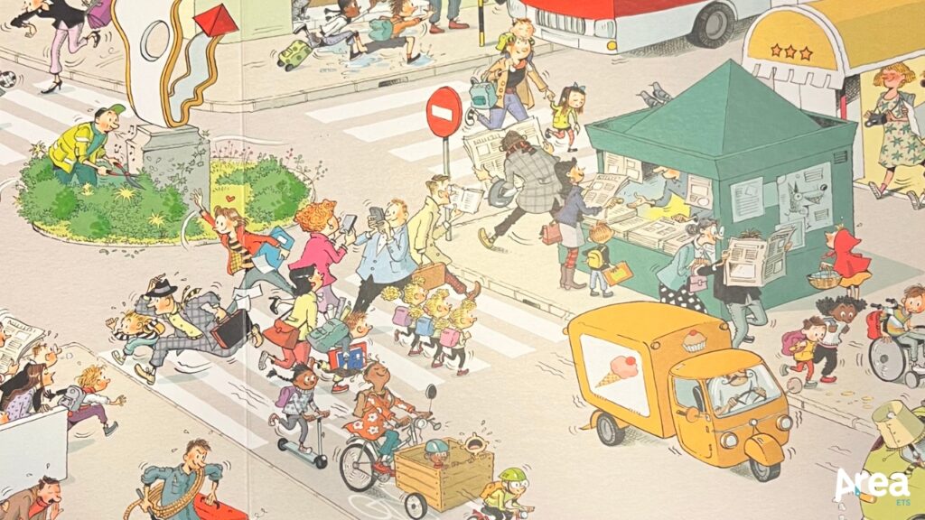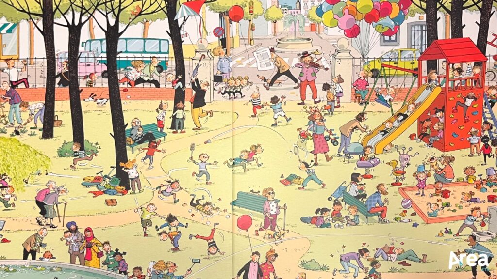 Guarda e scopri la città, wimmelbuch contemporaneo nato in Spagna e portato sugli scaffali italiani da Il leone Verde piccoli, è un libro brulicante ma anche un libro-gioco. Tra le sue pagine pullulanti è infatti possibile muoversi secondo approcci diversi: girovagando senza una meta precisa per cogliere i molti dettagli che animano ogni scena o setacciando quest’ultima con minuzia per trovare cose e personaggi suggeriti dall’autrice. Non c’è un approccio giusto e uno sbagliato. L’autrice caratterizza, infatti, ogni doppia pagina con una moltitudine di micro-situazioni che possono essere parimenti godute a ritmo lento e a ritmo serrato.
