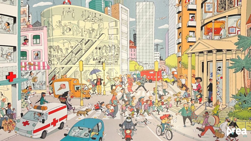 Cristina Losantos costruisce il suo racconto brulicante attraverso sette grandi tavole senza parole che immortalano scorci diversi della città. Qui il lettore ritrova, di fatto, personaggi ricorrenti, come se una cinepresa li seguisse nel loro percorso attraverso le vie del luogo. Possiamo così accompagnare, per esempio, la corsa di un uomo ginnico, il tour di una coppia di turisti, gli spostamenti di una classe, le performance di un musicista di strada e via dicendo. Come spesso accade quando questo tipo di modello di racconto per immagini viene proposto, il lettore ha modo di muoversi con particolare agio tra le diverse scene, scegliendo secondo i suoi gusti e/o le sue capacità, di godere delle singole scene che contengono di per sé delle situazioni narrativamente appaganti, o di godere del loro succedersi in maniera diacronica.
