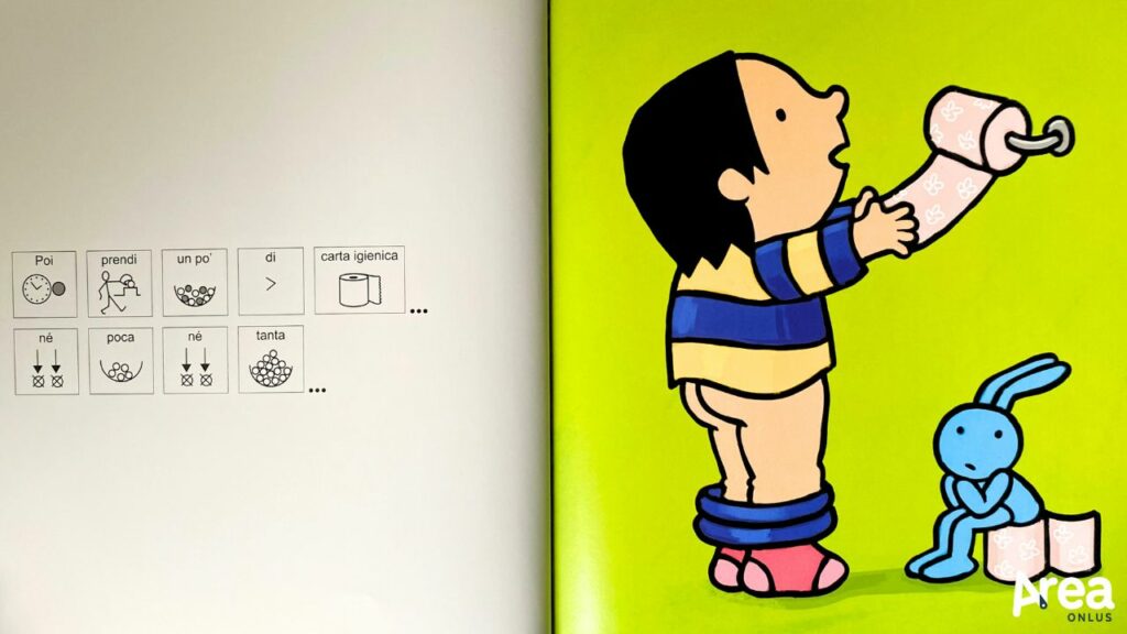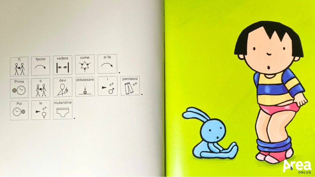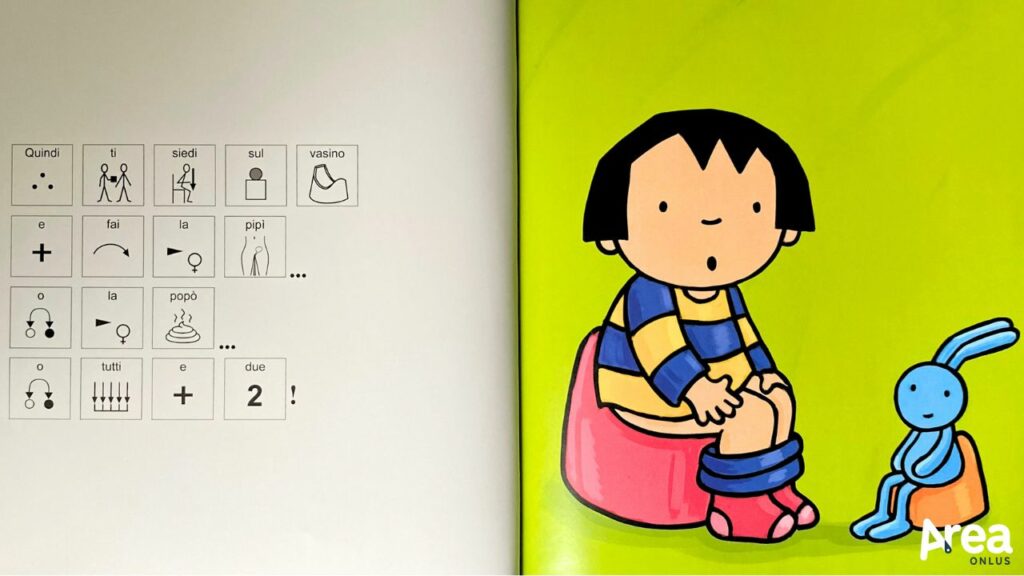 Anna impara a usare il vasino e Anna si lava i denti sono infatti resi disponibili dall’editore in una nuova versione (che non sostituisce ma si affianca a quella tradizionale) in cui il testo è supportato dei simboli della Comunicazione Aumentativa e Alternativa. Entrambi si rifanno nuovamente al modello inbook privilegiando il rispetto del testo, che non subisce dunque variazioni rispetto all’originale, l’uso di simboli WLS, la simbolizzazione dei singoli elementi lessicali e l’unione di parola e simbolo all’interno del riquadro. Ne risultano pagine piuttosto piene dal punto di vista grafico, benché i riquadri riescano a mantenere una dimensione sufficientemente ampia e la separazione netta e regolare tra pagina del testo e pagina dell’illustrazione faciliti l’orientamento del lettore.