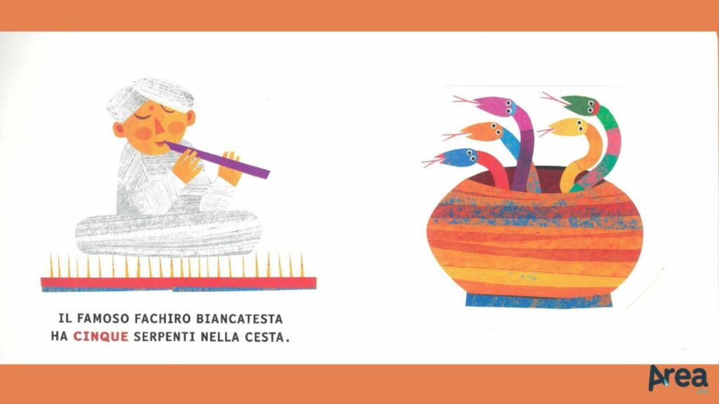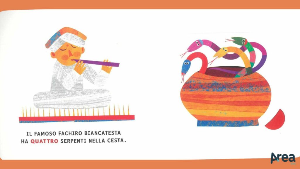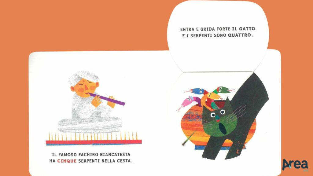 Il volume risulta, così, particolarmente fruibile (anche in quei casi in cui genitore e bambino abbiano piacere di condividere il momento della lettura ma il primo non padroneggi la lingua italiana) e capace di intercettare e sostenere l’attenzione. Il meccanismo delle alette, in particolare, incentiva la partecipazione attiva del lettore, sollecitandolo a scoprire come mai il numero di serpenti nella cesta del fachiro diminuisce ogni volta di un’unità.
