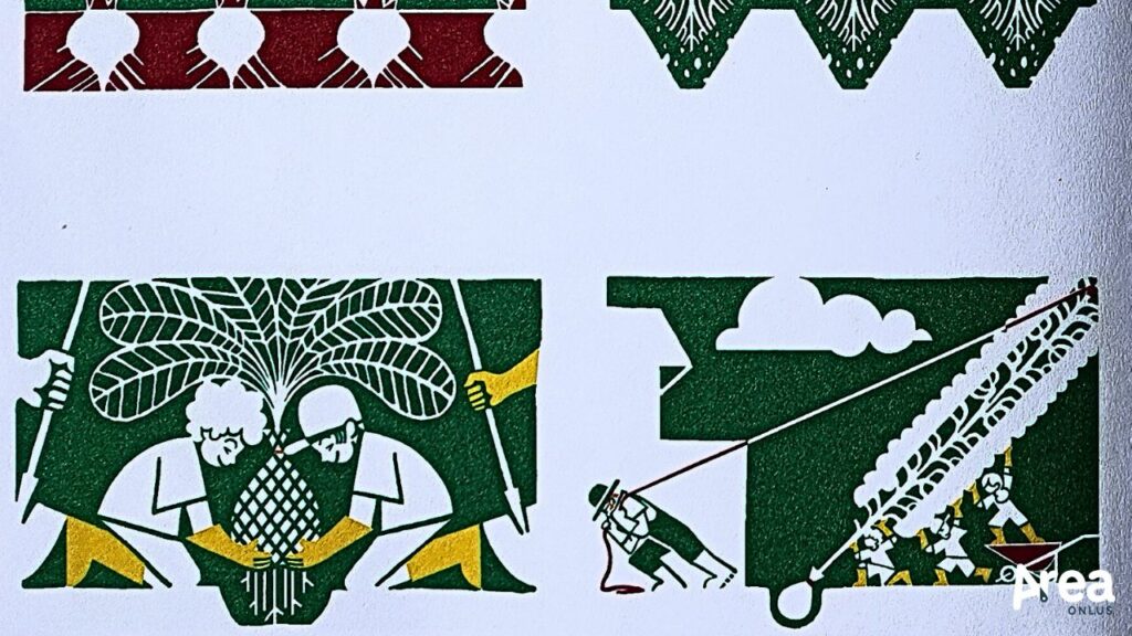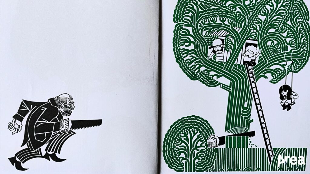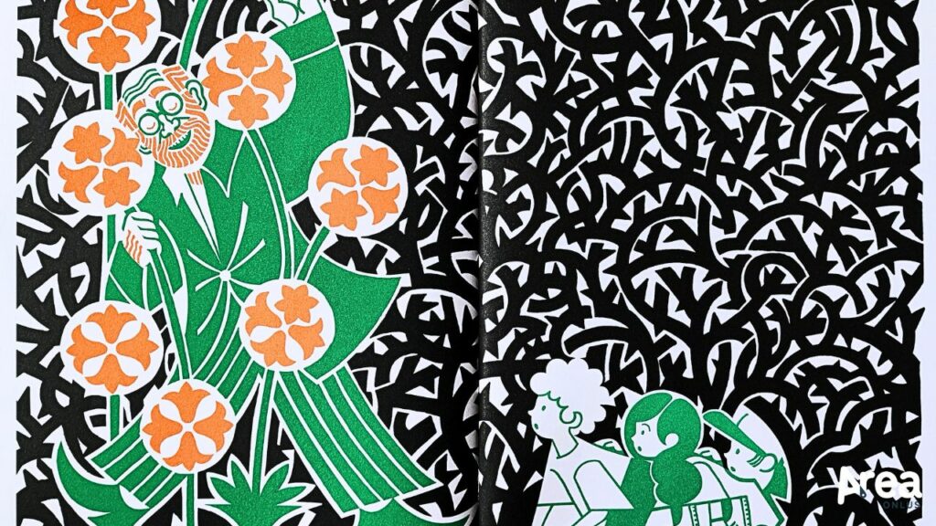 Il libro di Jeugov procede per sole immagini, caratterizzate da uno stile squisitamente liberty, lo stesso che contraddistingue la villa di campagna che ha ispirato e in cui è nata la storia de Il fiore ritrovato. Colori saturi, contorni marcati, motivi grafici e gusto per la decorazione costituiscono dunque la cifra di questo libro senza parole che gioca essenzialmente sul contrasto tra nero, bianco, verde e arancione (con qualche lampo rosso e giallo là dove il finale celebra la trasformazione più piena) e che si compone di tavole dall’effetto ipnotico. Raffinate e di grande impatto, queste ultime richiedono una certa capacità di districarsi tra figure stilizzate e composizioni affollate per godere a pieno del racconto. Per contro, quest’ultimo mette in campo tutti gli indizi di cui il lettore necessita per muoversi con agio tra le pagine, seguendo senza indugio il filo narrativo. Abilissimo nel disseminare dettagli significativi, l’autore guida, infatti, con perizia e pazienza il dipanamento della trama, offrendo una lettura appassionante e appagante per lettori dall’occhio attento.