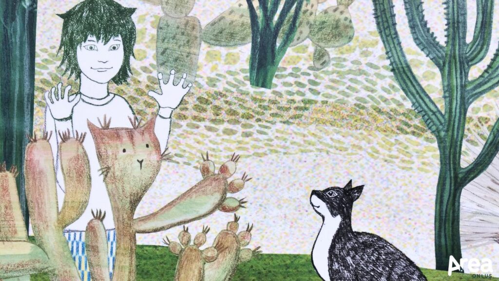 Al centro dell’albo di sole immagini di Maine Neuendorff c’è un giardino straordinario – un giardino dei sogni, per l’appunto – in cui le misure del tempo e dello spazio assumono nuovi contorni. Qui veniamo condotti da due bambini, fratelli si presume, a loro volta intenti a seguire un curioso gatto nero comparso per strada. Una volta varcato il cancello di questo che è a suo modo un giardino segreto, i bambini, il gatto e con loro il lettore, assaporano e sperimentano una natura fantastica, tra rami abitati da uccelli di ogni specie, ninfee che sostengono i pisolini, steli d’erba su cui ci si può sedere e cactus dalle forme feline. Sagome e dimensioni inattese, particolari ammiccanti, animali nascosti tra le foglie richiedono un occhio attento e un’immaginazione aperta, per dar fondo a un’esplorazione in cui i confini tra reale e onirico si fanno labilissimi.