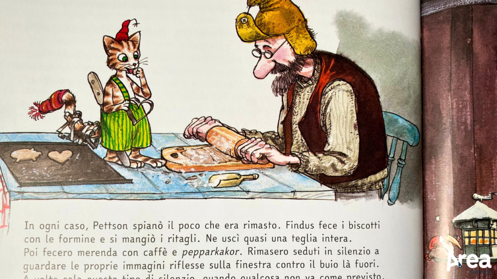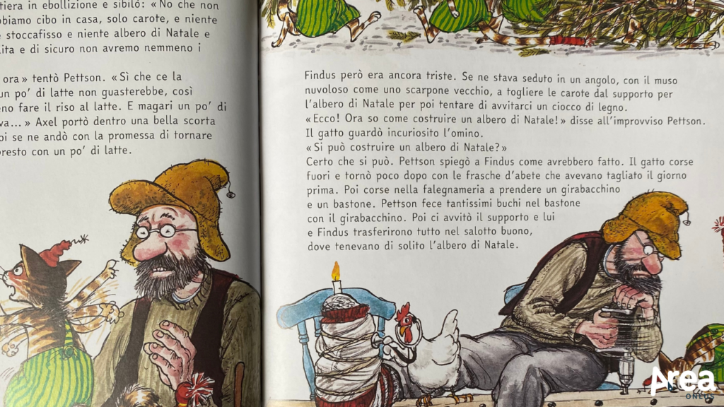 Il Natale di Pettson presenta, dal canto suo, tutte queste caratteristiche e propone una storia che profuma intensamente di festa. Decisi a celebrare come si deve il Natale, Pettson e Findus si preparano a una vigilia operosa in cui non possono mancare il taglio e la decorazione dell’abete, la preparazione di piatti tradizionali e le pulizie di casa. Una brutta (ma buffa) caduta dallo slittino costringe però Pettson all’immobilità e così, con somma delusione di Findus, albero e delizie culinarie sembrano sfumare: toccherà accontentarsi di cibo ordinario e decorazioni di recupero. Non tutto è perduto però: quando i vicini di casa scoprono dell’incidente di Pettson, la casa torna a risplendere. I piatti e la gioia delle feste non mancheranno, alla fine. E anche un albero decorato con cucchiai, orologi e termometri finirà per dire forte e chiara la magia del Natale.