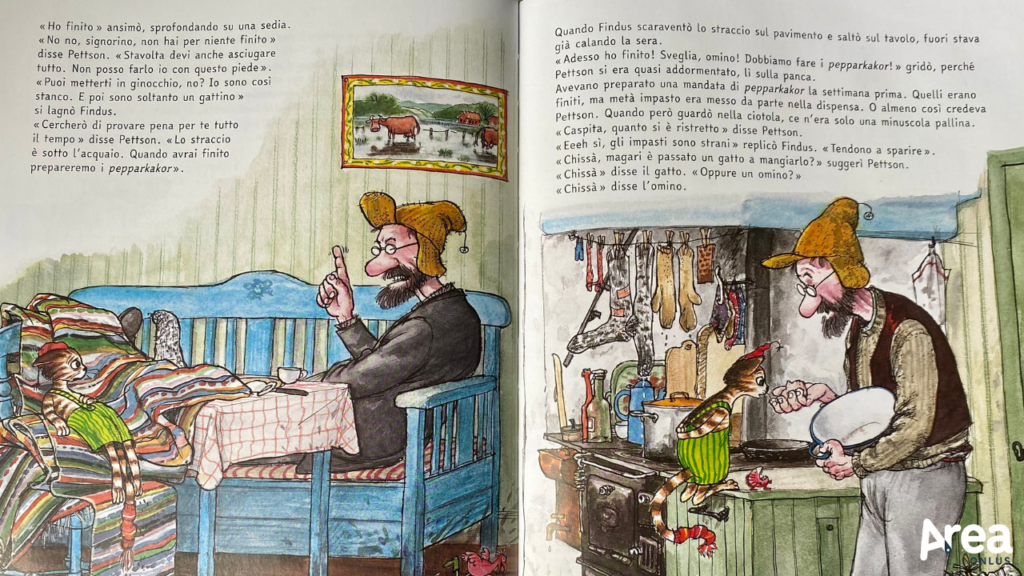 Il gatto Findus e il suo padrone Pettson, inventati dall’autore svedese Sven Nordqvist, sono due personaggi irresistibili e così, ça va sans dire, sono le loro avventure. Inaugurate dal volume Una torta per Findus, queste sono state portate in Italia da Camelozampa che le sta pian piano raccogliendo e proponendo all’interno di una bella collana dedicata del suo catalogo. Sono avventure cui vale la pena dedicare attenzione perché offrono letture abbordabili e accattivanti che possono rappresentare una validissima proposta anche per i lettori più riluttanti o che sperimentino difficoltà legate alla dislessia. Non solo, infatti, la collana Pettson e Findus è impaginata e stampata dall’editore con alcune caratteristiche di alta leggibilità come il font EasyReading, la sbandieratura a destra e un minimo di spaziatura in più tra le parole e le righe, ma i volumi che la compongono si caratterizzano per una lunghezza contenuta, un ampio spazio riservato alle illustrazioni, testi perlopiù paratattici e ritmo sostenuto. Al lettore vengono cioè offerte delle storie gradevolissime, ricche di avvenimenti sempre diversi ma animate da due protagonisti ricorrenti e familiari, presentate in una forma che riserva un ruolo significativo alle figure (molto dinamiche e particolareggiate) ma che al contempo amplia la misura del racconto rispetto a ciò che accade in un albo illustrato.
