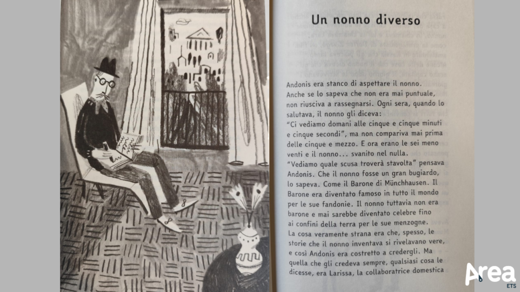 Ne racconta di storie, il nonno di Andonis! E il nipote, comprensibilmente, si chiede di continuo se siano vere o meno. Racconta storie quando banalmente arriva in ritardo, nonno Marios, ma anche quando, più sentimentalmente, evoca il suo passato da giramondo. Attore di teatro esiliato durante la dittatura greca, il nonno ha vissuto sulla sua pelle grandi eventi come il ‘68 parigino, eventi che nei suoi racconti restano sospesi tra il reale e l’immaginario, sicché il decenne Andonis oscilla tra il fascino che emana un passato avventuroso e il timore che qualcosa gli venga costantemente tenuto nascosto. Come tutto ciò che riguarda la nonna, per esempio, di cui nessuno in famiglia parla. Chi era? Dove è finita? Perché tutti tacciono quando viene citata? E così silenzi e mistero alimentano una visione talvolta distorta e talvolta surreale della storia famigliare fino a quando, una serie di viaggi in cui il nonno porta con sé Andonis, gli consentono di ritrovare i pezzi mancanti a una visione d’insieme. Quei viaggi saranno l’occasione per conoscere direttamente alcune tracce di quel passato favoloso narrato dal nonno e per rafforzare il legame che lo lega a quest’ultimo: un legame che si alimenta di esperienze sui generis, citazioni di classici, conversazioni da grandi e che rivela forse tutta la sua intensità proprio quando il nonno viene a mancare.