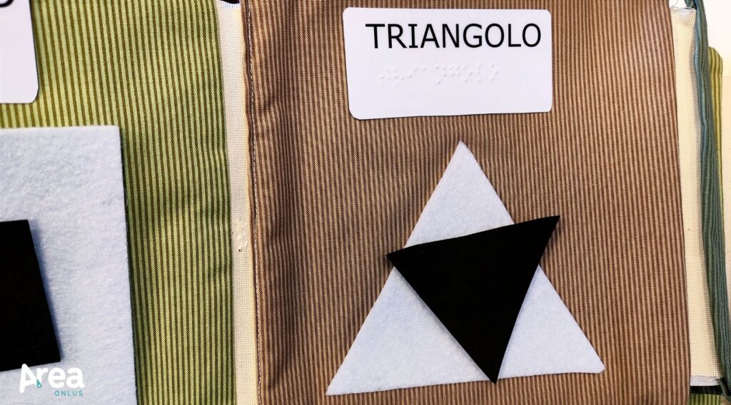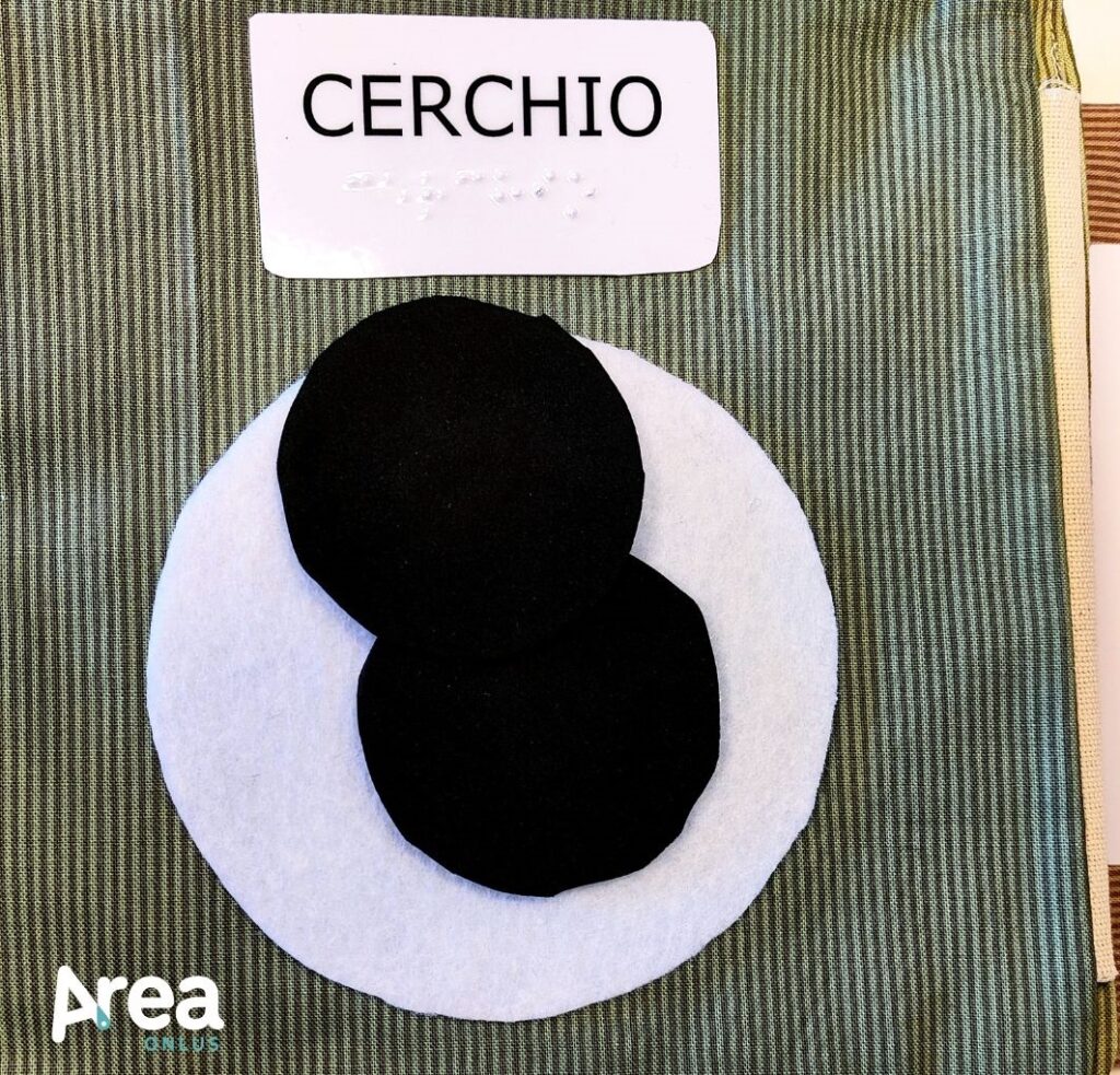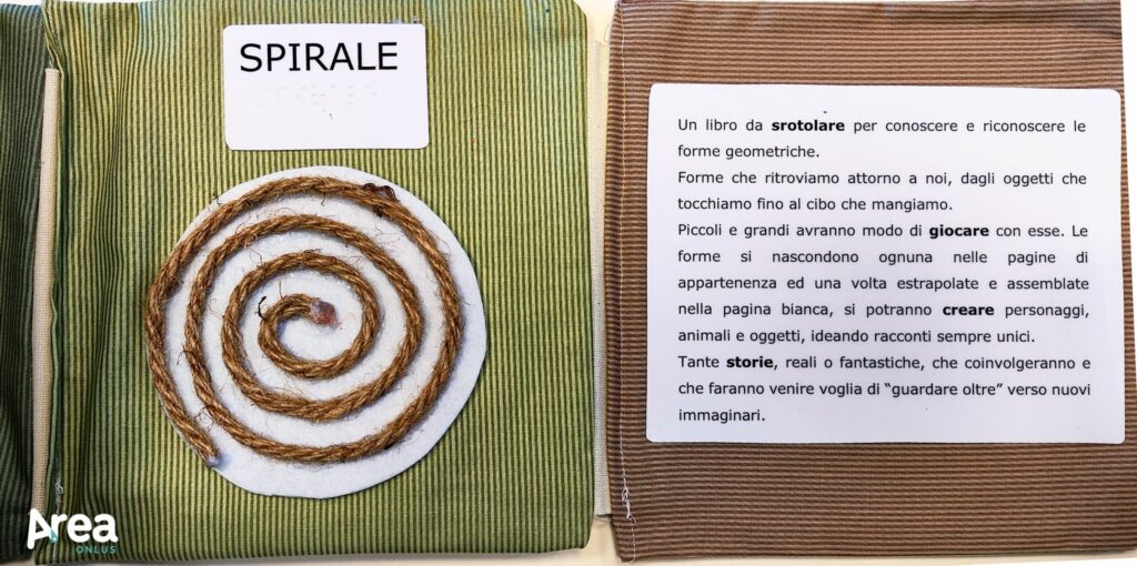 Ecco allora che un lato del libro dedica ogni pagina a una forma – cerchio, quadrato, triangolo, semicerchio, rettangolo, spirale – proponendo di ciascuna la parola corrispondente in nero e in Braille e la forma da toccare in feltro bianco (più un pezzo di corda per la spirale). Ma non è tutto: sorpresa! Ogni forma si rivela in realtà essere una tasca che contiene elementi in gomma crepla nera che riproducono la forma in cui sono contenuti, semplicemente più in piccolo.