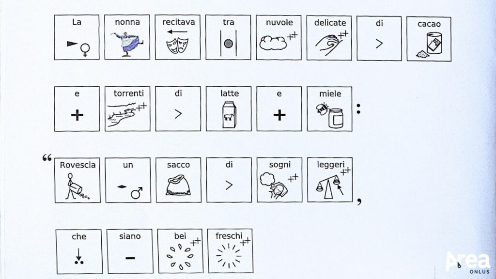 E questo, se da un lato costituisce una sfida altissima per lettori con difficoltà comunicative che vogliano e possano cimentarsi con una lettura più complessa e insolita, dall’altro lancia un messaggio molto forte rispetto alla possibilità che i libri in simboli possano rappresentare una lettura che non riguarda necessariamente solo chi abitualmente impiega la CAA. L’inbook de La ricetta della strafelicità di dice insomma che i simboli possono raccontare tanti tipi di storie e che le storie in simboli possono incontrare tanti tipi di lettori.