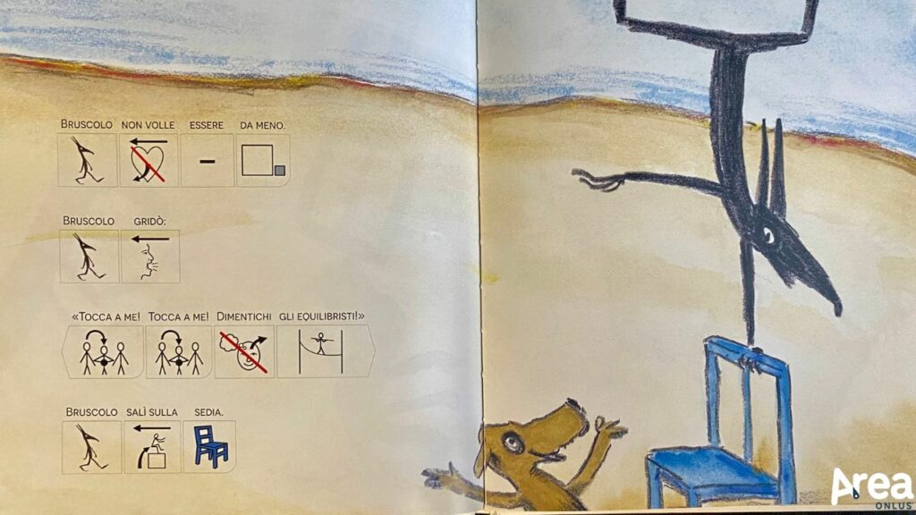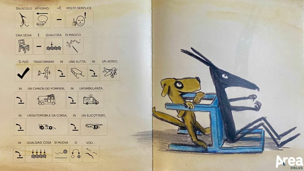 Insieme a Mangerei volentieri un bambino, La sedia blu è il titolo con cui Officina Babùk ha inaugurato la sua produzione editoriale. Si tratta di un titolo già noto a molti lettori, perché in catalogo dal 2011 per Babalibri, e che in questa versione viene proposto in simboli. Nata dalla collaborazione tra Uovonero e Babalibri, Officina Babùk è infatti una neonata casa editrice specializzata nella pubblicazione di albi illustrati in cui il testo è supportato visivamente dai simboli della Comunicazione Aumentativa e Alternativa. Il suo catalogo, che per ora attinge principalmente al vasto, ricco e curato ventaglio di titoli di Babalibri di cui offre una versione accessibile, raccoglie di fatto il testimone dello splendido progetto “I libri di Camilla” di Uovonero che dal 2016 al 2022 (ma i cui titoli sono tuttora disponibili) ha consentito la pubblicazione di una versione simbolizzata di una decina di albi molto apprezzati di diverse case editrici tra cui Topipittori, Giralangolo, Kalandraka e Sinnos. In linea con la filosofia de I libri di Camilla, Officina Babùk promuove con i suoi libri l’idea che la lettura possa costituire un potente strumento di inclusione e che le storie più amate e diffuse tra i bambini necessitino di molteplici versioni capaci di consentire una reale condivisione di immaginari anche da parte di coloro che leggono e comunicano in maniere non convenzionali.