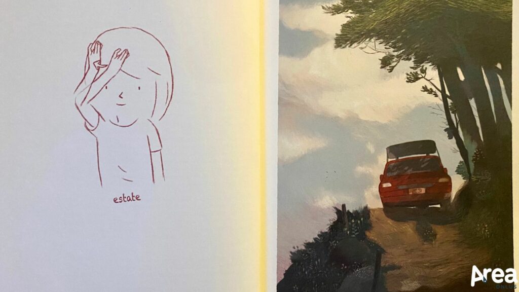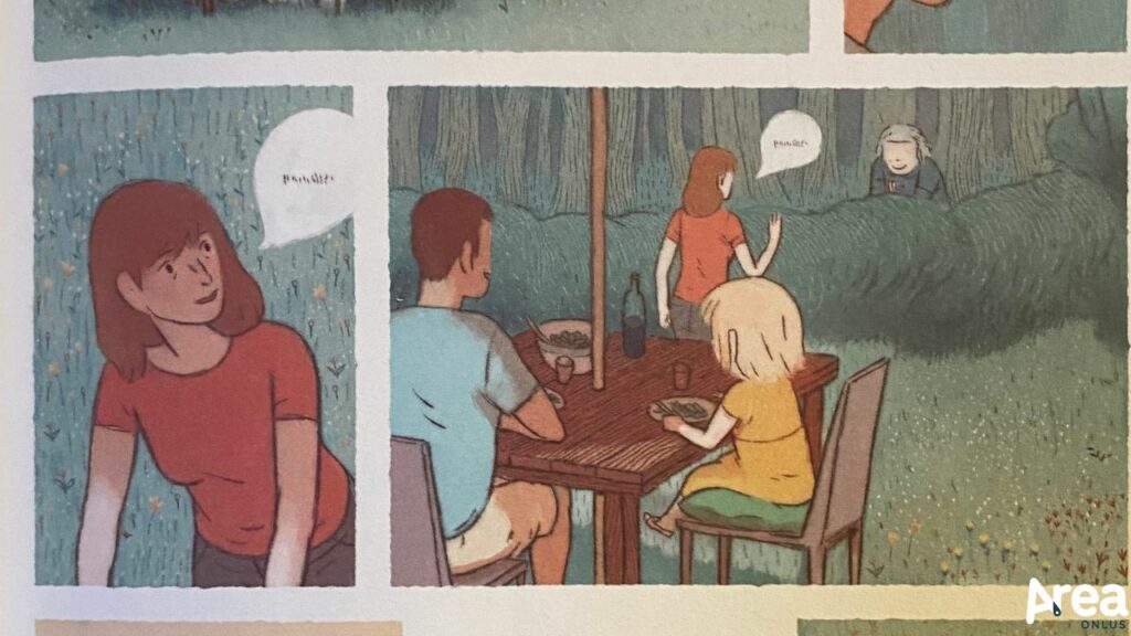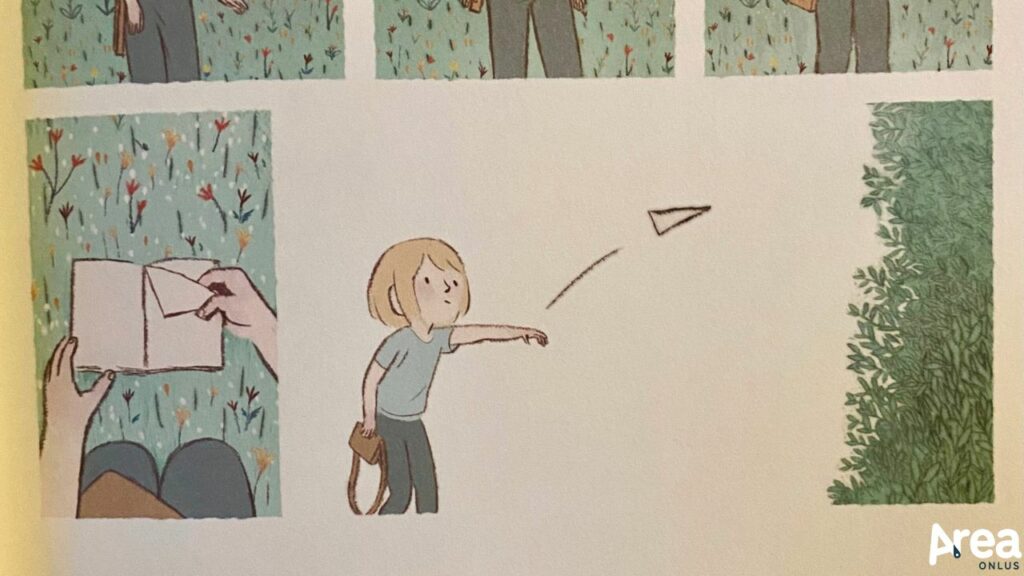 La piccola protagonista del volume sperimenta sulla sua pelle non solo lo straniamento di vivere in un mondo indecrifrabile, ben rappresentato da balloons vuoti o contenenti segni incomprensibili, ma anche la mortificazione di sentirsi chiamata ad apprendere una lingua che sente non appartenerle. Per questo, quando si trasferisce con i genitori (udenti) in una nuova casa in campagna e trova un vecchio manuale di segni usati dai sub, il suo approccio alla vita cambia. Il mondo esplorato, sognato e visto assume, infatti, nuovi contorni nel momento in cui può essere detto in una maniera per lei significativa. Di fatto è come se per la prima volta quel mondo iniziasse davvero a esistere. Lo notiamo all’interno delle dinamiche familiari ma anche nei momenti di intima solitudine e nel gioco con il nuovo amico che accompagna la bambina in avventurose esplorazioni. Ma curiosamente il mondo subacqueo si intreccia a quello della bambina lungo tutto il racconto, quando i discorsi non uditi e dunque compresi assumono le sembianze di pesci sfuggenti e trasformano l’ambiente in una sorta di acquario. Così, quando sul finale delle forti piogge provocano un allagamento imprevisto, tutto sembra tenersi e tornare, in una sorta di cerchio metaforico di grande impatto.