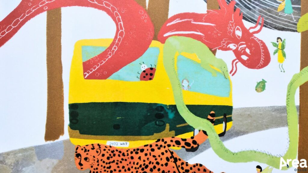 Chi l’ha detto che il tempo dell’attesa debba essere per forza immobile e noioso? Basta sapere cosa farci! A inventare mondi e creature, osservando e lasciandosi ispirare da ciò che ci circonda e ci accade intorno, i minuti passano, per esempio, in un lampo. Così, alla fermata di un bus, possono presentarsi draghi e lucertoloni, possono affollarsi aerei ed elicotteri e ci si può immergere in mondi sottomarini. Mentre gli adulti sembrano subire passivamente il tempo trascorso sotto la pensilina, la bambina protagonista di Ma quando arriva? si gode a pieno il qui e ora, perché capace di trasformarlo in molti altrove.