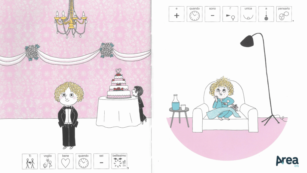 Qui più che altrove, il ruolo giocato dalle figure nel supportare la comprensione si fa decisivo. In questo senso, il fatto che lo stile dell’illustratrice appaia molto pulito, essenziale e focalizzato solo sui dettagli realmente significativi risulta facilitante. I simboli scelti, così come da modello in-book, fanno parte della collezione WLS e sono impiegati in riferimento alle singole parole (compresi articoli, preposizioni, congiunzioni…). La brevità del testo fa tuttavia sì che il numero di simboli presenti su ogni pagina sia circoscritto e che il modeling, di conseguenza, non risulti particolarmente ostico.