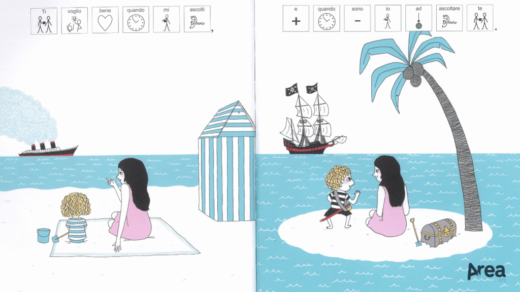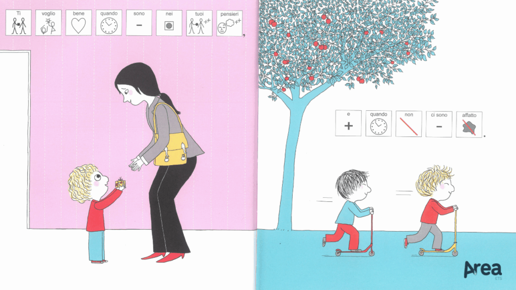 In questa specifica tipologia di libri rientra anche il recente adattamento dell’albo Mi vorrai sempre bene, mamma?. Scritto da Astrid Desbordes e illustrato da Pauline Martin, il libro presenta già dalla sua versione originale alcune caratteristiche funzionali alla simbolizzazione. Contraddistinto da una struttura binaria (due concetti speculari per ogni doppia pagina, ciascuno espresso da una sola frase) e da costrutti sintattici ricorsivi (Ti voglio bene quando…), Mi vorrai sempre bene, mamma? propone al lettore un’architettura narrativa la cui regolarità agevola la comprensione.