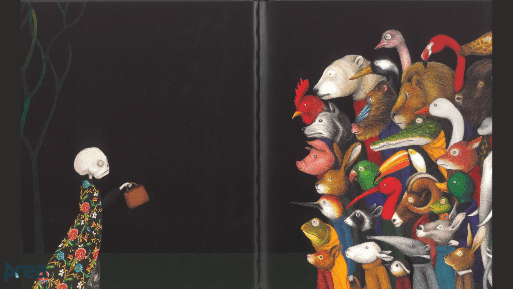 Compatte e solidali, queste figure dalle sembianze animali ma dallo spirito profondamente umano, si muovono nel buio, verso l’ignoto. Si aiutano, si tengono, si stringono. Affrontano come un unico corpo le paure e i lutti che, inevitabili, il viaggio porta con sé. Insieme a loro viaggia in sella a uccello azzurro una creatura minuta e discreta con volto di teschio. È la morte, certo, compagna inesorabile e pietosa che si fa carico di chi si perde per strada mentre gli altri sono costretti a proseguire. Li aspetta, sul finale, uno scenario potenzialmente fiorito: un anelito di speranza che l’autrice offre al lettore.