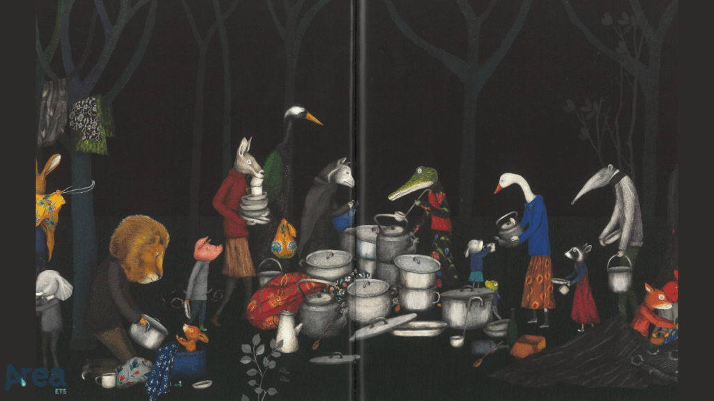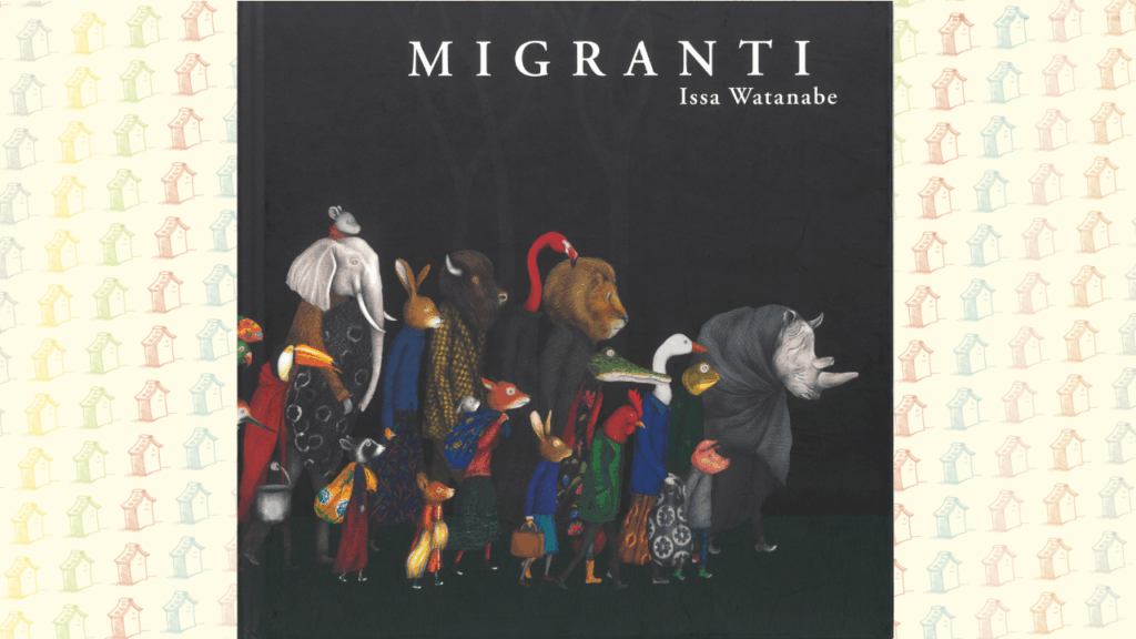 Lo stile di Issa Watanabe è inconfondibile, la sua poetica profondissima. Si prenda, ad esempio, il suo silent book Migranti. L’autrice riesce a coniugare un tema attuale e drammatico come quello della migrazione con illustrazioni meravigliose e dal potere ipnotico. Gravità e bellezza. Incanto e dolore. Le sue figure antropomorfe dai tratti minuziosi e dai dettagli vivaci, si stagliano su uno sfondo nero che pare quasi tenerle sospese. Su quello sfondo denso che tutto sembra assorbire, quelle figure antropomorfe si muovono ora timorose, ora rassegnate, ma sempre resilienti. Sono Migranti, per l’appunto. Il loro è un viaggio evidentemente forzato e duro: lo dicono i loro volti segnati e chini, lo dicono i loro bagagli minimi e raffazzonati, lo dicono i loro tentativi di tenersi vivi anche quando tutto, intorno, sembrerebbe invitare alla rinuncia.