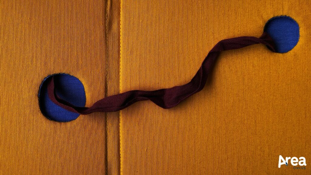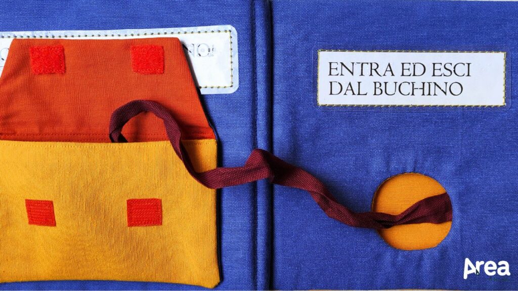 Protagonista del libro è per l’appunto un nastrino dorato che il bambino è invitato a far viaggiare di pagina in pagina, attraverso una serie di buchi tondi. Il nastrino è custodito in una taschina di stoffa collocata sulla prima pagina e da qui viene estratto. Una volta terminato il percorso, il nastrino può essere riposto in una taschina simile alla prima, collocata in chiusura. Minimalissimo nei testi, che si limitano a una frase di saluto e a un invito a far avanzare il nastro, il volume presenta un solo buco per ogni pagina, così da agevolarne il reperimento e rendere l’operazione di ingresso e uscita del nastro alla portata di dita inesperte. Sia che godano sia che non godano del supporto della vista, queste si possono muovere con un certo agio e piacere su pagine accoglienti, trovando nel libro un terreno di esplorazione e gioco stimolante e appagante.