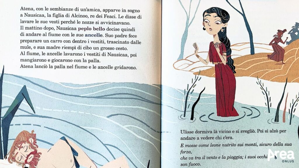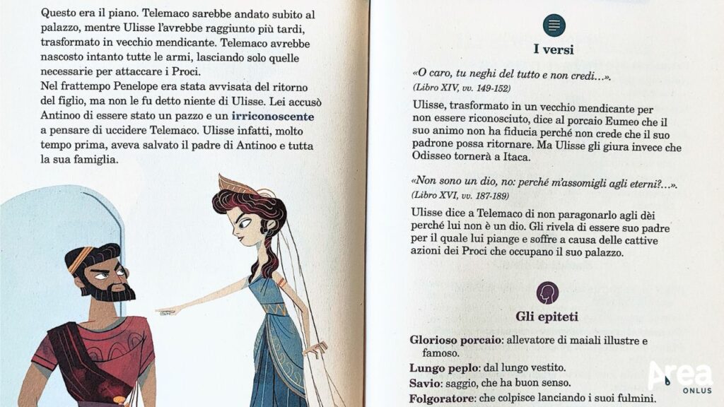 Curata da Carlo Scataglini e illustrata da Flavia Sorrentino, la versione de l’Odissea proposta da Erickson all’interno della collana I classici facili rappresenta un compromesso interessante tra accessibilità e apertura a generi e testi complessi. Proposto senza sacrificare alcun episodio saliente del capolavoro di Omero, quest’Odissea opta per un testo in prosa di agevole approccio. Le illustrazioni, frequentissime e importanti per sostenere la lettura, richiamano nelle linee il gusto artistico ellenico, contribuendo a far immergere il lettore nell’atmosfera unica del capolavoro di Omero.