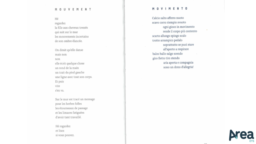 Chiara è italiana. Bernard è francese. Susie è americana. Ognuno di loro scrive in una lingua diversa e il libro pubblicato da Pension Lepic mette in valore questa varietà, scegliendo di non tradurre le poesie ma di lasciarle nella loro lingua originale. La meraviglia, in fondo, sta anche nel godere di sonorità evocative, che solleticano l’immaginazione, senza necessariamente padroneggiare a pieno la lingua da cui sono attinte.