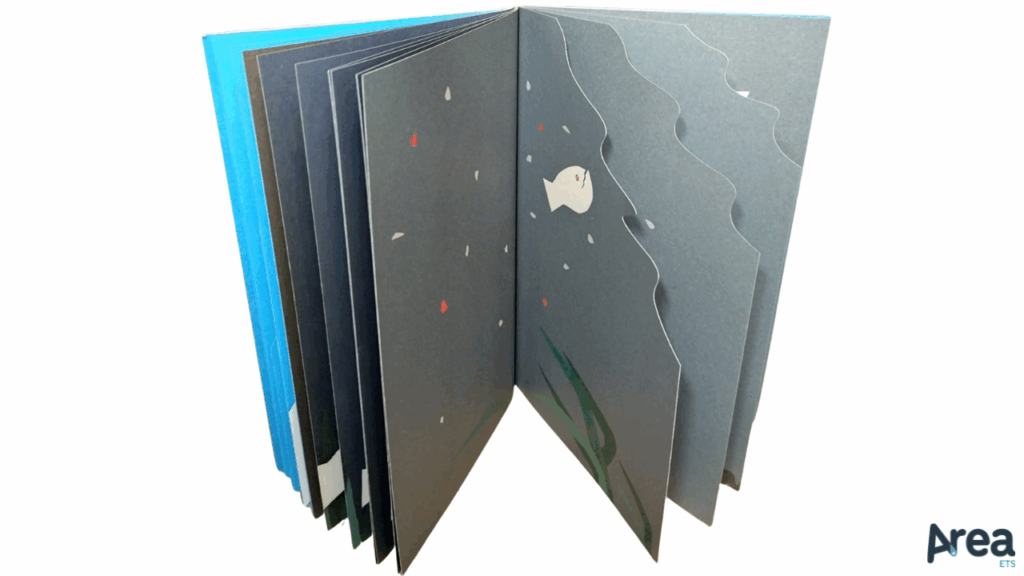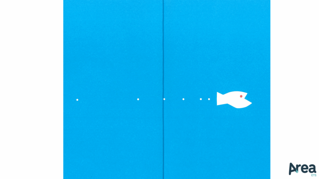 Qui si ritrova, infatti, tutto lo stile minimale e inconfondibile dell’artista giapponese, fatto di forme minime e talvolta appena abbozzate, di equilibri cromatici studiatissimi e di stimolanti giochi di intagli, fori e pieghe. Con una maestria che è sinceramente incantevole, Komagata allestisce le pagine come fossero scenari, e trasformando la storia del pesce Pacu Pacu in un pretesto di contatto ed esplorazione della carta, dei suoi bordi, dei suoi contorni e dei suoi contenuti. L’esperienza di lettura rivela, in questo senso, un elevato grado di accessibilità sia in ragione della predisposizione a un’interazione fisica con l’oggetto libro, sia in ragione di un racconto che procede in maniera molto essenziale senza far uso di parole scritte.
