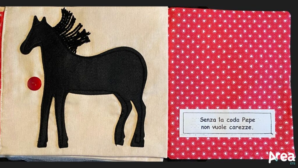 Composto da sottili pagine in stoffa color crema, Pepe senza coda si caratterizza per il ricorso a illustrazioni minimali, la cui essenzialità è frutto di uno studio accorto e generatrice di un connubio interessante tra estetica e funzionalità. Tutto si basa su sagome nere di cavalli che, oltre a dare alla pagina un aspetto molto raffinato, risultano estremamente riconoscibili: lo spessore è, infatti, adeguato e tutti gli elementi più significativi dell’animale sono presenti (4 zampe, orecchie a punta, muso lungo, criniera e – per chi ce l’ha – una coda). E poiché il libro parla proprio di somiglianza e diversità, l’autrice gioca con l’aggiunta di pochi elementi distintivi, di volta in volta differenti, applicati su una sagoma che è invece sempre identica (se non per la misura). Il lettore che esplora le figure con le dita sarà dunque fortemente agevolato nel suo compito di decodifica.