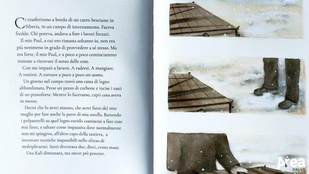 Sobrio nel racconto e accorato nelle figure, non a caso Per mano è narrato dal punto di vista della mano sinistra stessa, simbolo e testimone privilegiato non solo o non tanto delle discriminazioni subite quanto delle occasioni colte di farsi portatrice di bellezza e ricchezza. Tra queste pagine in cui in cui dominano i toni opachi bruni e beige, risuonano pagine dolorose della storia e si intrecciano guerra e musica, vita e pensiero, cultura e quotidianità, tracciando sentieri suggestivi da percorrere anche all’interno di un percorso squisitamente scolastico.