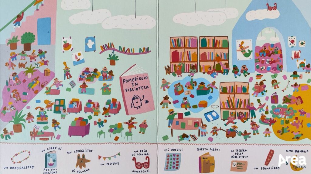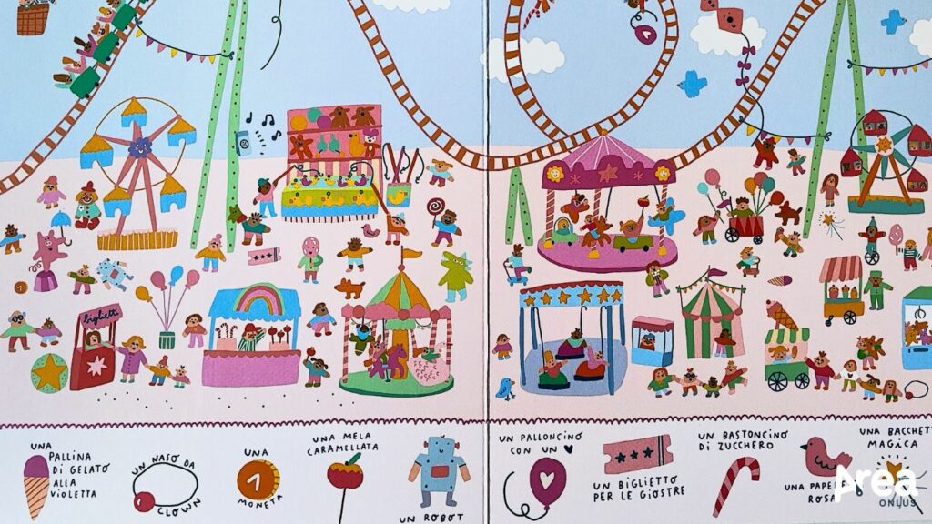 Assenza di parole, gioco e moltiplicazione dei percorsi di esplorazione della pagina costituiscono una bella combinazione, anche e soprattutto in ottica di accessibilità. Tra le scene confezionate da Charlotte Klein, infatti, anche il lettore che normalmente fatica a mantenere salda l’attenzione o a seguire percorsi narrativi troppo rigidi o lunghi può muoversi con agio, rispettare il proprio ritmo, trovare le proprie parole per dire ciò che accade e seguire i suoi binari, perché di fatto non c’è un giusto e uno sbagliato. Le microstorie che l’autrice imbastisce si consumano inoltre nello spazio di una scena, sono cioè istantanee e non proseguono di pagina in pagina, e questo fa sì che anche la memoria di lavoro richiesta possa essere ridotta. La presenza, infine, di elementi da rinvenire, oltre a incentivare l’esplorazione e a mantenere vivo l’interesse attivando un appetibile meccanismo di sfida, può aiutare il lettore a riconoscere (anche linguisticamente) gli oggetti e a orientarsi in una scena potenzialmente caotica, trovando cioè una direzione lungo la quale muoversi per dare un senso a ciò che vede. Il gioco può farsi dunque divertimento, stimolo, prova e bussola, contribuendo a definire la multisfaccettatura di un libro solo all’apparenza semplice.