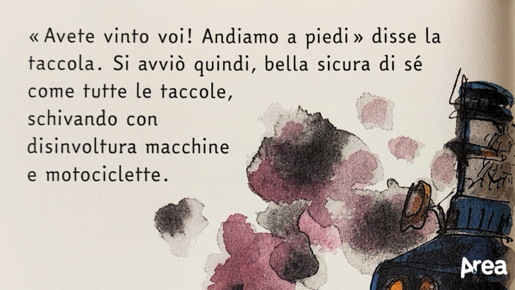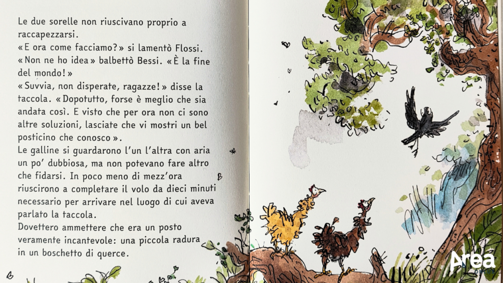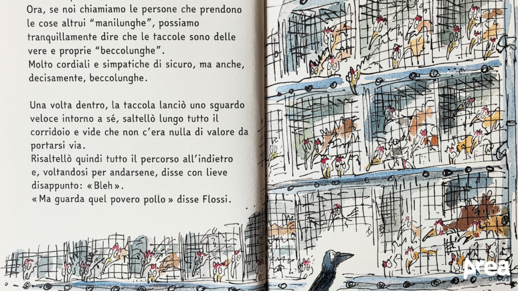 Nato da un’accoppiata vincente e collaudata quale quella tra John Yeoman e Quentin Blake, Piume in libertà proclama la sua inglesitudine in ogni aspetto. L’ironia sottile e molto british che anima il testo, tradotto con accortezza da Luigi Berio (che è peraltro il curatore del corto animato dedicato al silent book di Quentin Blake Clown), trova infatti eco e riflesso nel tratto schizzato ed essenziale che caratterizza le figure. Con quel loro modo ingenuo e da comari di procedere e guardarsi intorno, inoltre, Flossi e Bessi ricordano un po’ l’Adelina e la Guendalina Bla Bla degli Aristogatti che galline, certo, non sono ma pennute inglesissime sì!