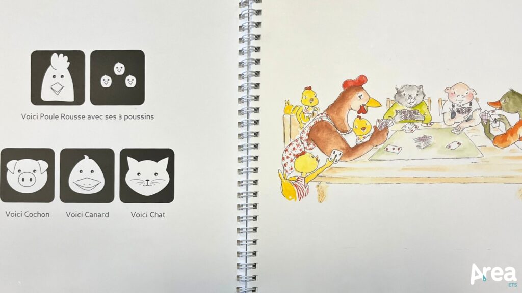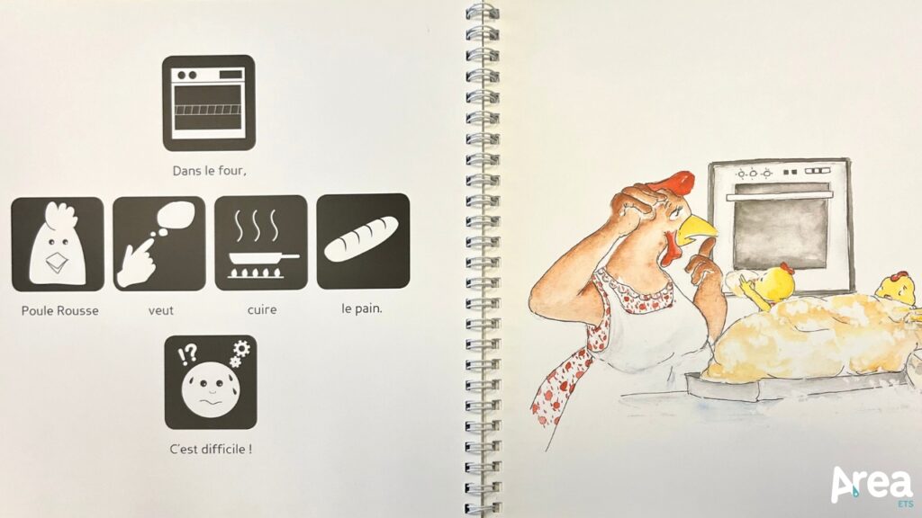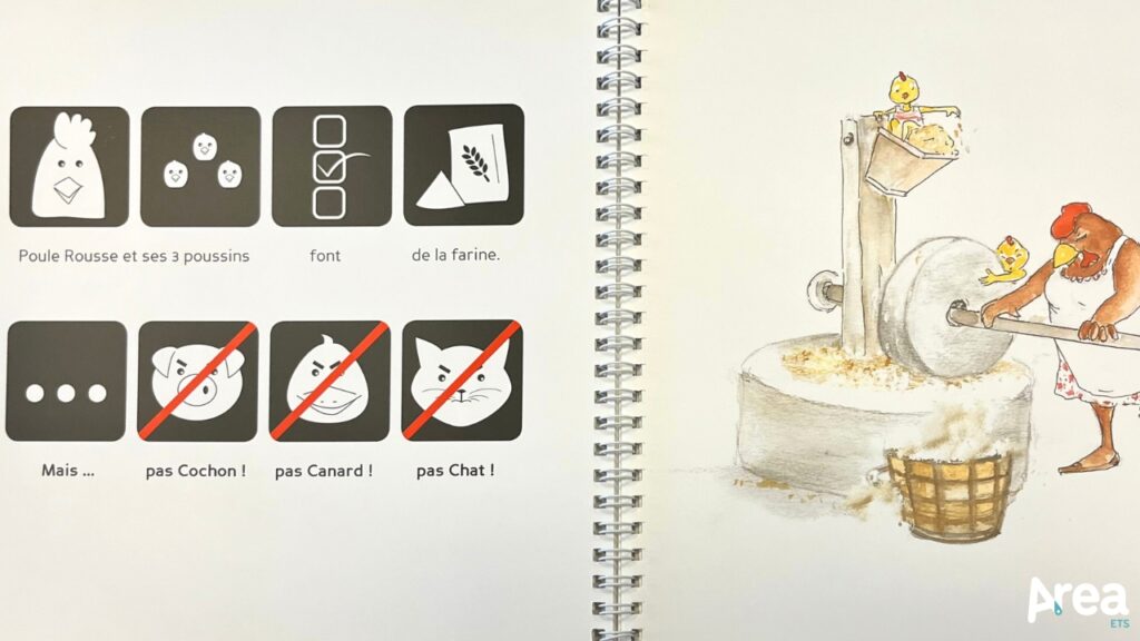 Malgrado si tratti di un libro in simboli e dunque di un tipo di libro diffuso anche nel nostro paese, Poule Rousse non appare del tutto assimilabile ai volumi ispirati alla Comunicazione Aumentativa e Alternativa cui siamo abituati. I simboli che comprende non fanno infatti riferimento a una galleria precostituita o convenzionale bensì sono appositamente disegnati da uno degli autori del libro. Stampati in bianco su sfondo quadrato nero, questi appaiono ben distinguibili ed estremamente chiari, con un grado di trasparenza paragonabile ai nostri PCS. Limitatissimi nel numero (massimo 6-7 per pagina) questi simboli offrono una rappresentazione grafica degli elementi lessicali della frase dando vita a un racconto essenziale che ben si adatta alla semplicità della fiaba scelta.
