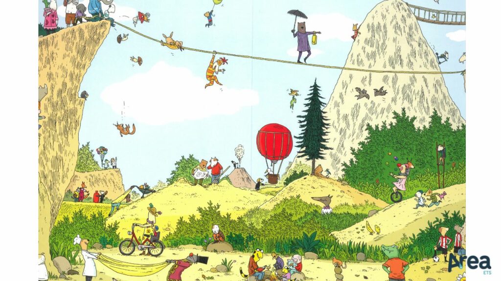 Qui si svela, di fatto, il motivo dei numerosi allenamenti del rinoceronte o della fuga della gallina. Qui la squadra di ostinati scavatori gode infine del meritato tesoro. E qui l’orsetto volato via con un palloncino riesce finalmente ad atterrare (per il sollievo del papà e del venditore di palloncini). Ma qui si ritrovano anche tutti quei personaggi che nelle pagine precedenti non combinano granché ma che semplicemente vanno a zonzo, si incontrano, si fermano e formano di volta in volta nuovi gruppi di interesse. Perché i pomeriggi di primavera sono così: oziosi, splendidi e ricchi, anche quando non succede nulla di speciale.